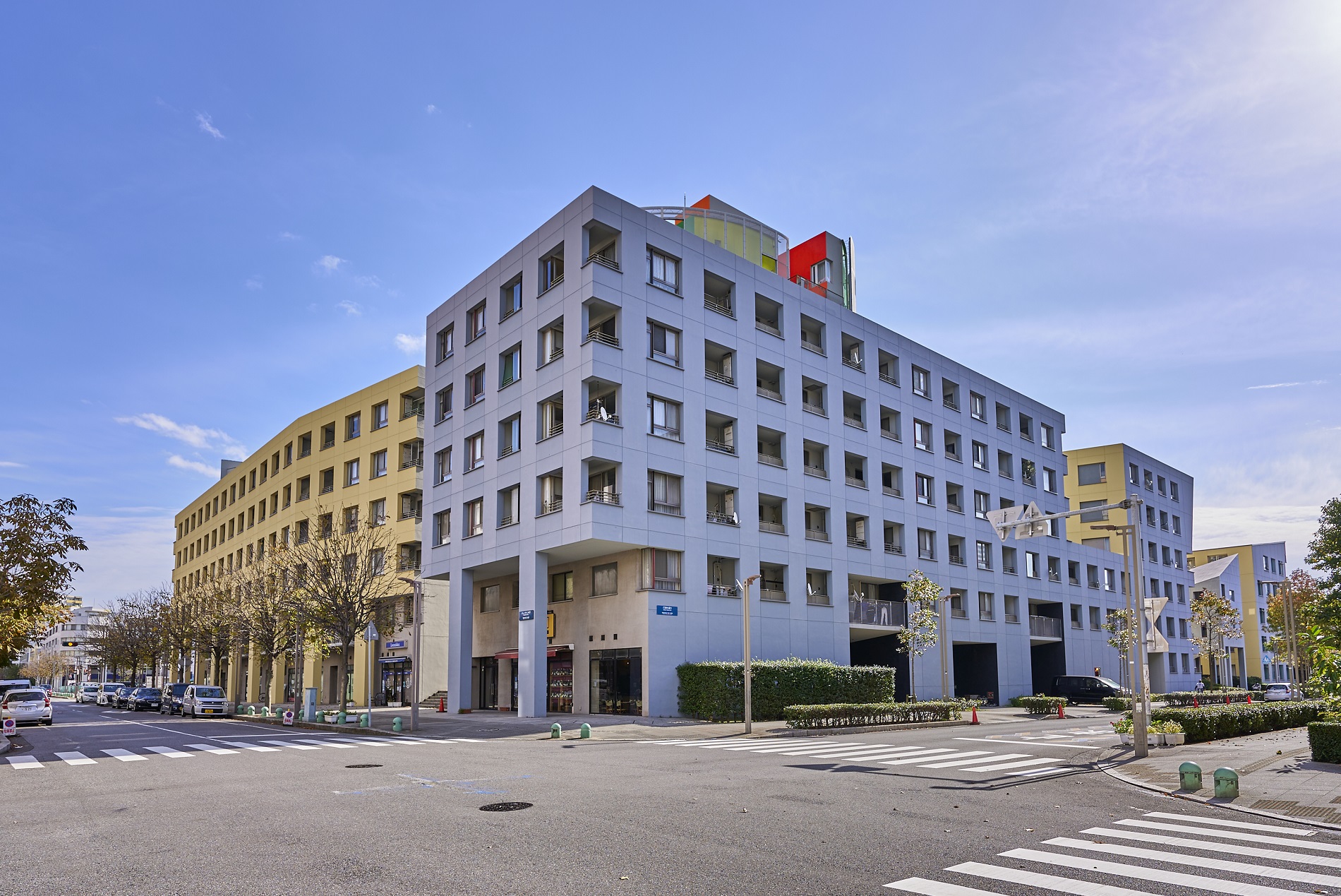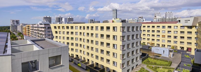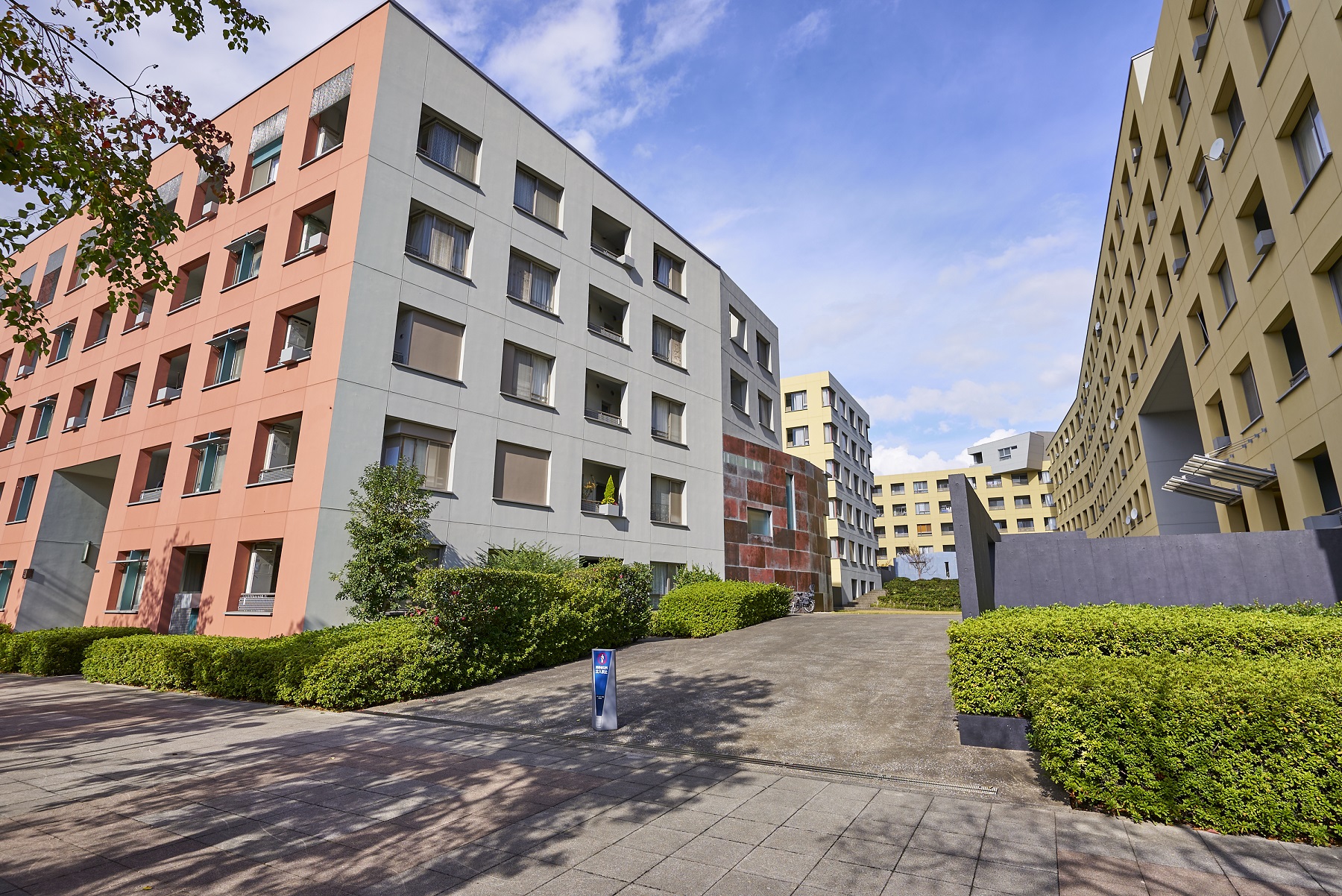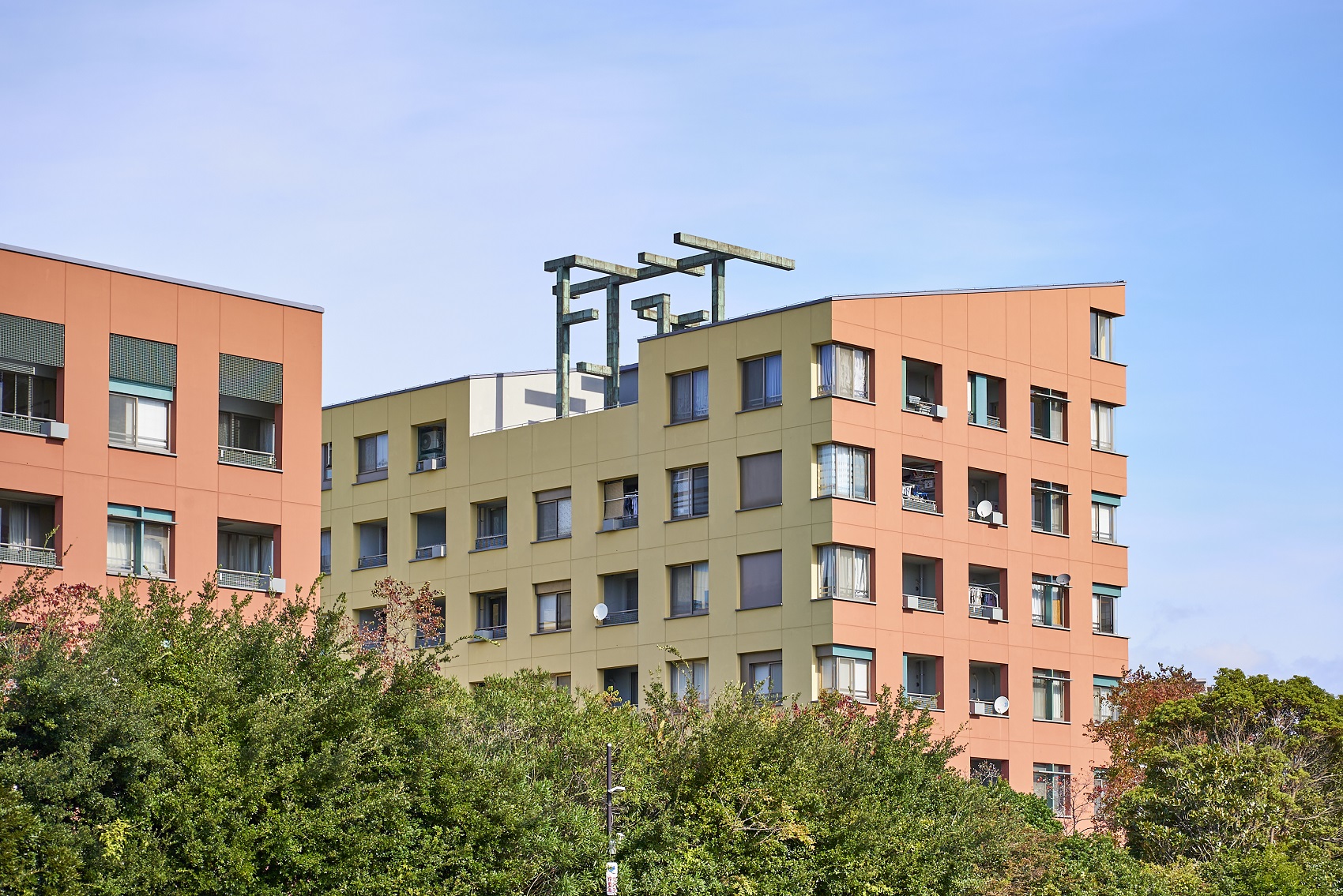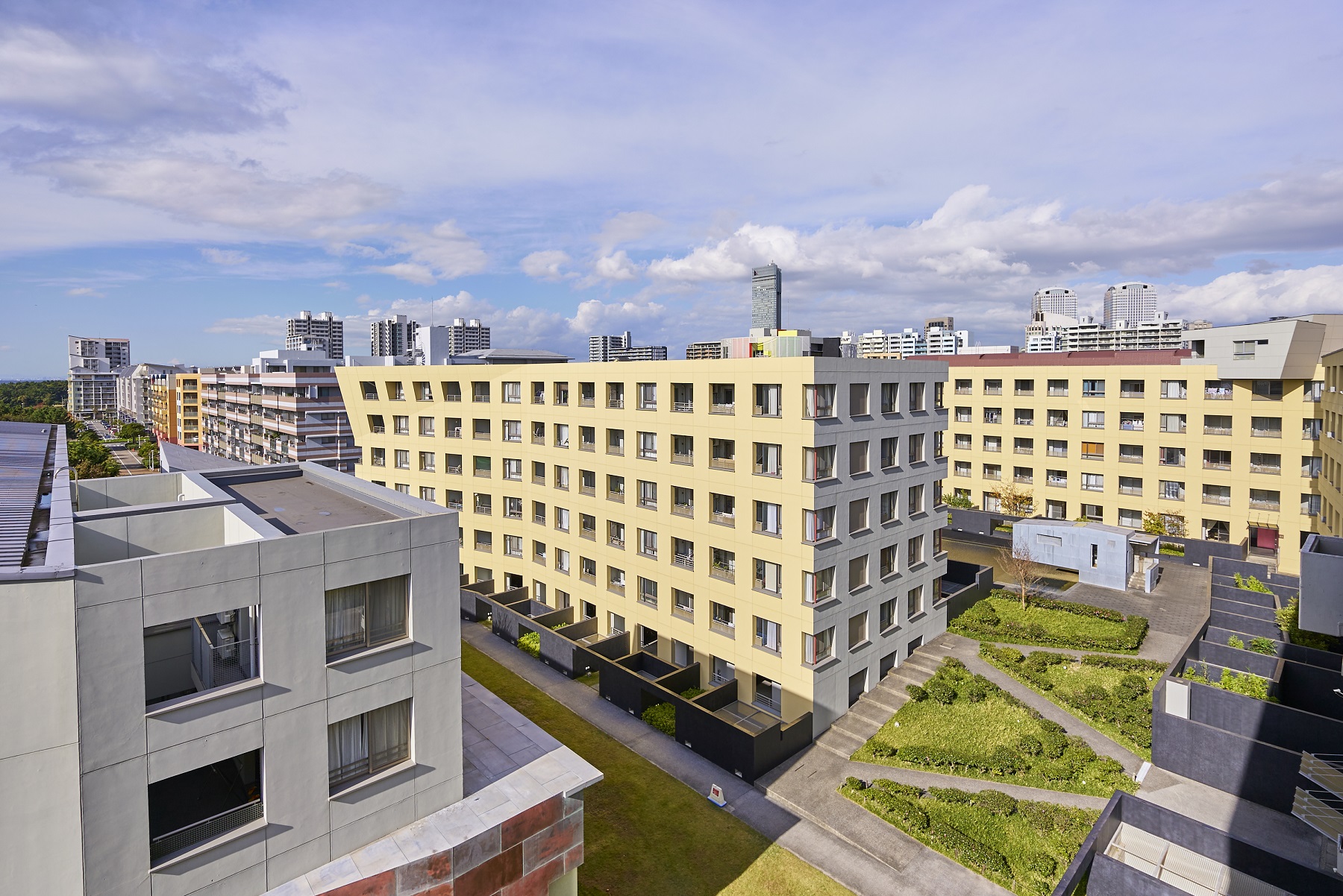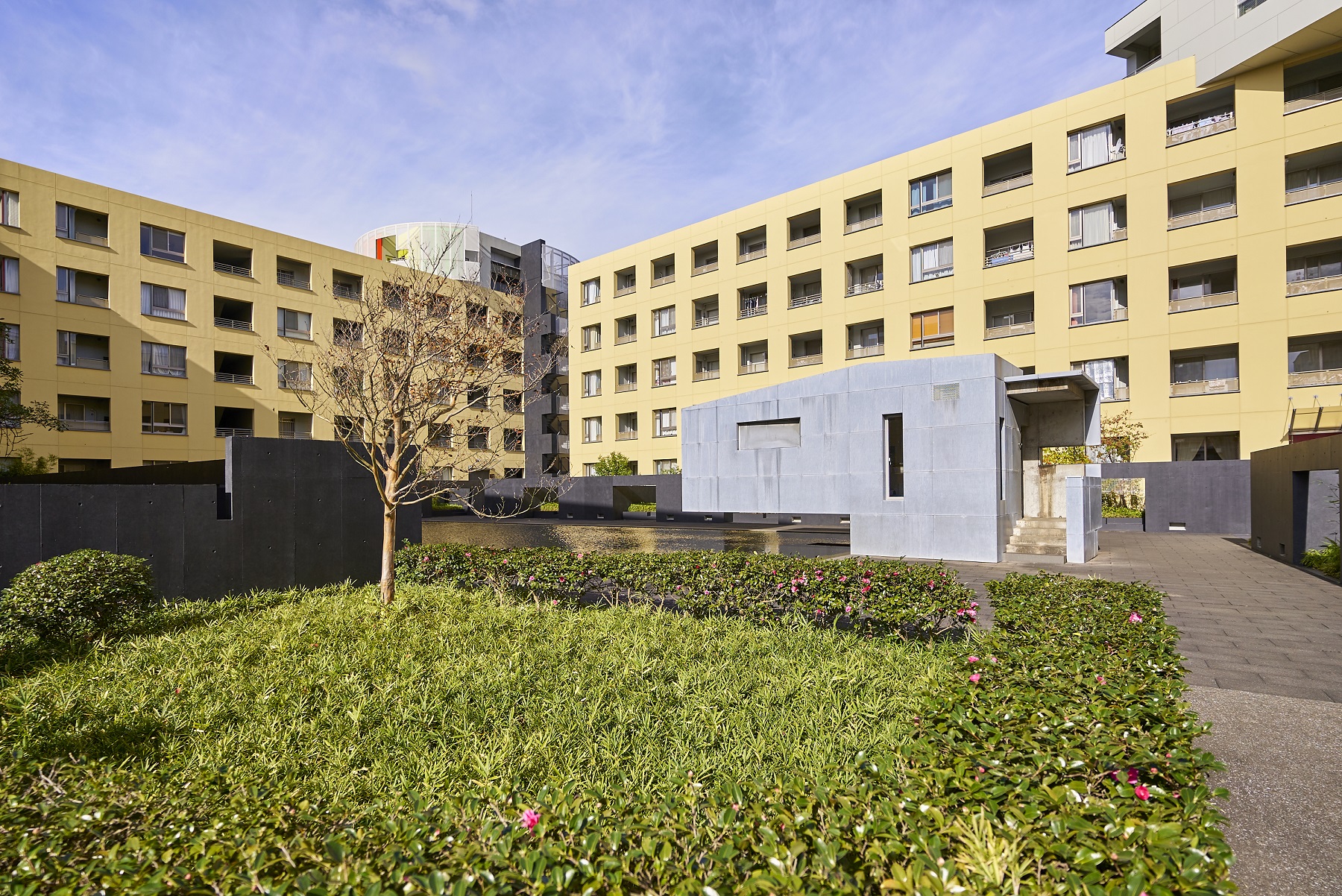 建物の外観は、その面する通りによって多少の差異はあるものの、基本的にはすべて同じデザインで街としての統一感を出しています。大きな特長は、ベアリングウォールというデザイン方式の採用。これは建物の構造躯体に開口部を設けるもので、住戸ごとの窓やバルコニー、共用廊下などはこの躯体の中にすっぽりと包み込まれることになります。その結果、凹凸のない平面に、変化をもたせた開口部がリズミカルに連続し、モダンで美しい外観を創り出しています。外壁の色彩は4つの住棟ごとそれぞれに個性的。各住棟とも基壇部にあたる部分は共通性を持たせた色彩とし、中間部は、東面と北面の外壁は淡い黄色を、南面は柔らかなブラウンを、西面はシックな青ねず色を、そして北面の一部は気品のあるあさぎ色を配色。周辺の景観の中でもきわだった美しさを見せています。また、街の各ゲートや中庭に全部で6つの構築物を配置。あたかも離れのように独立して造られたこの家々はそれぞれに個性的にデザインされ、街に豊かな表情をもたらしています。