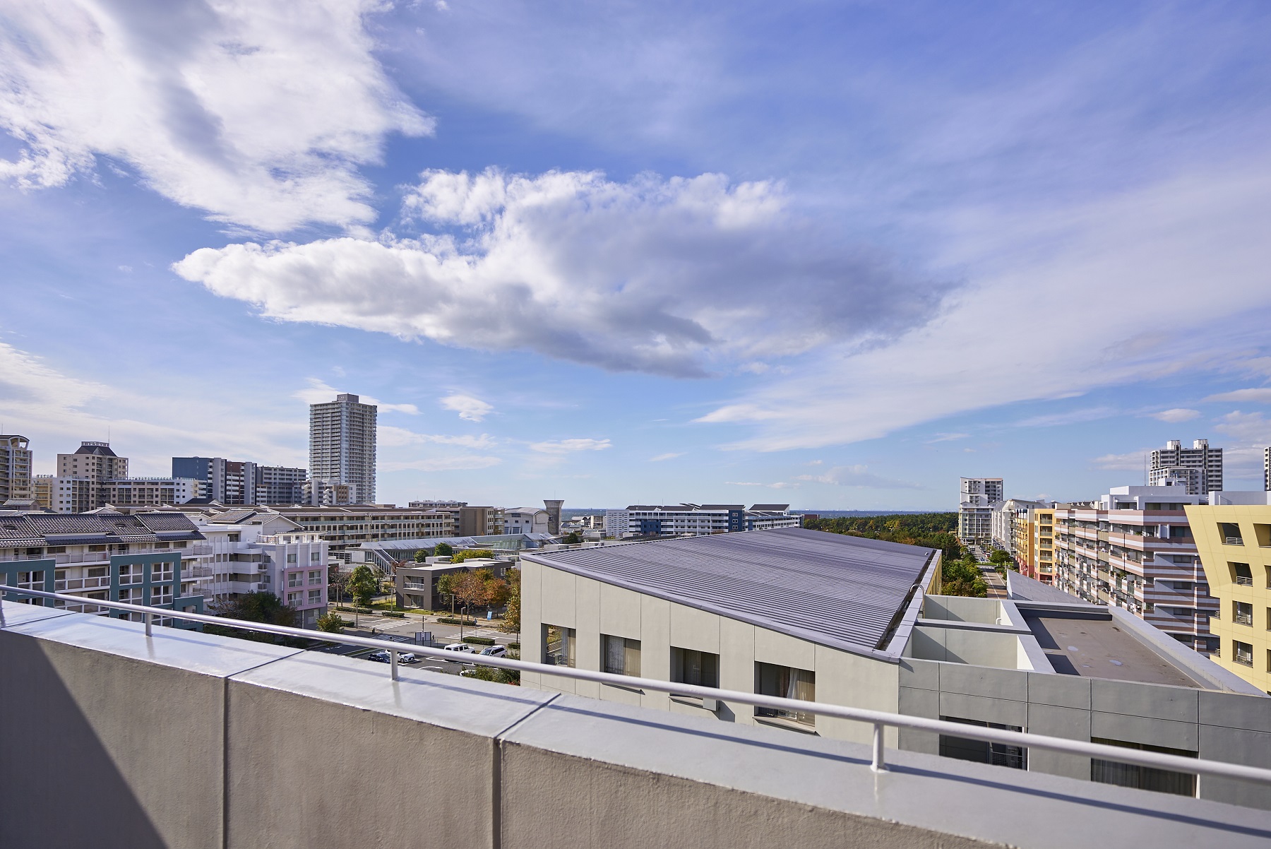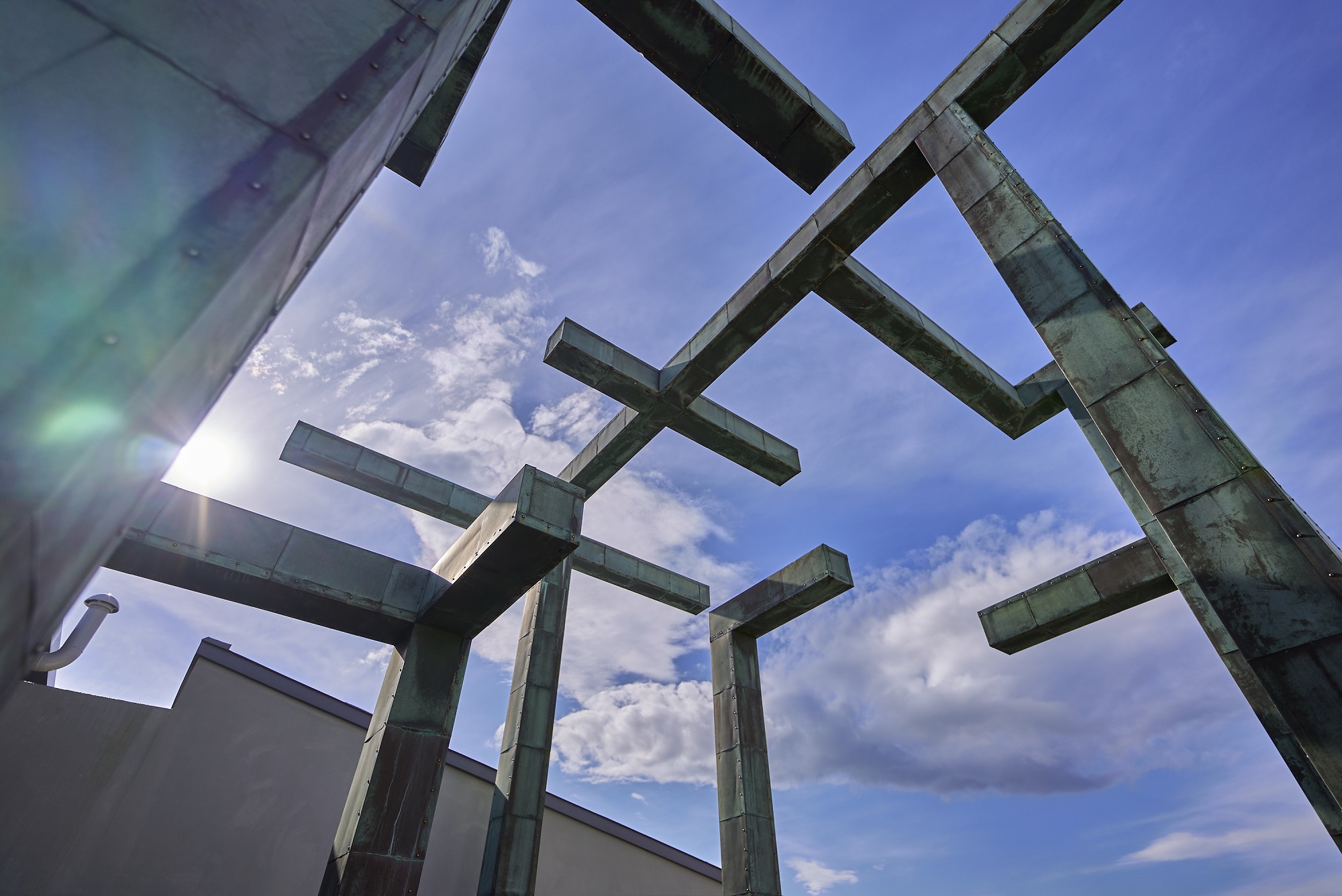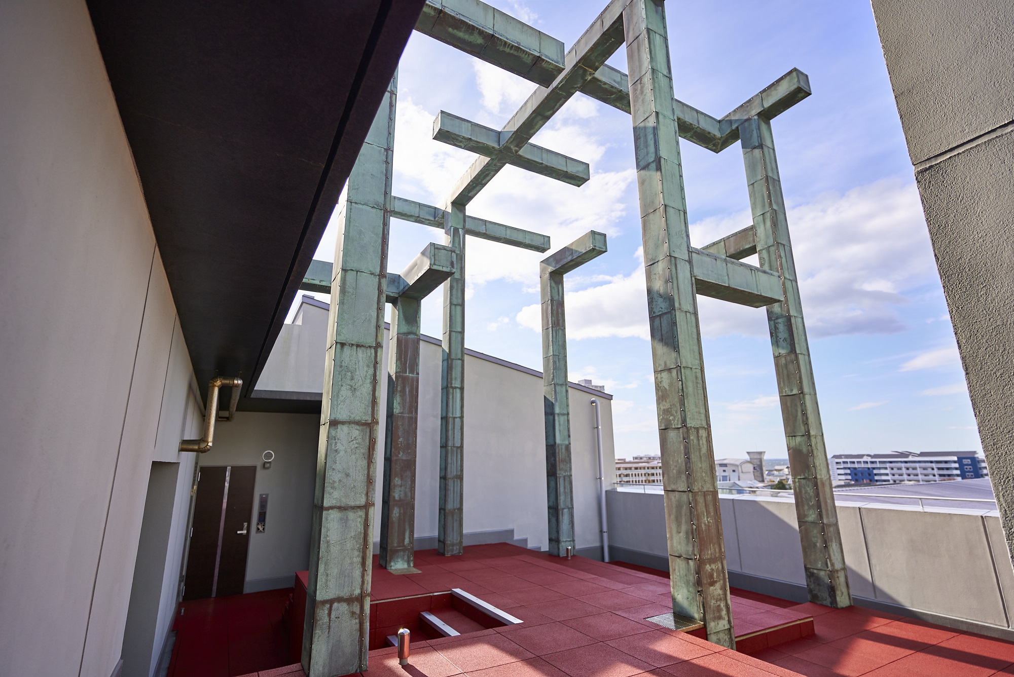 さらに、イースタン・コートの南端上階には、ビューデッキが設けられています。柱のみによって構成され、爽やかな風が吹き抜けていくこの展望台は、いわば街のモニュメント。夜間にはライトアップされ、その姿を浮かび上がらせます。