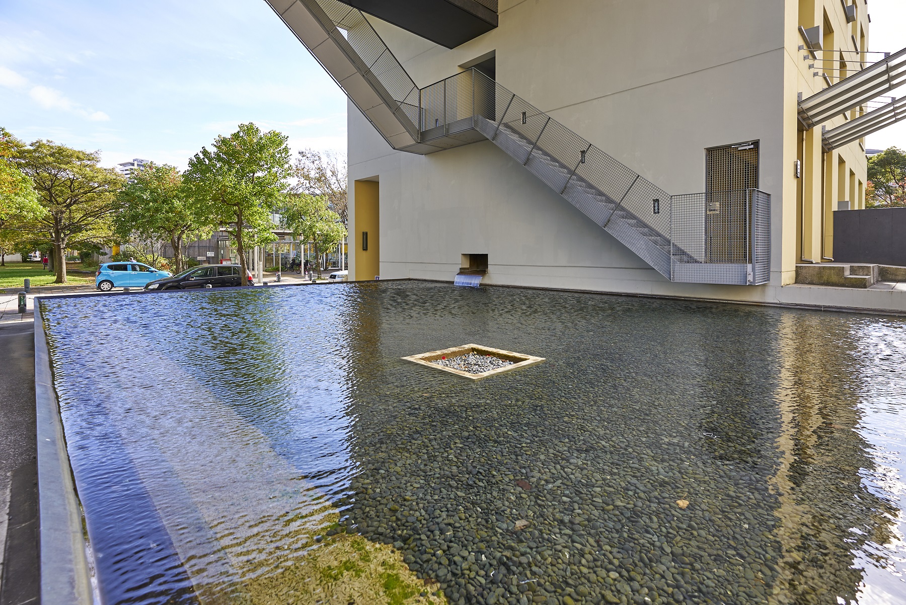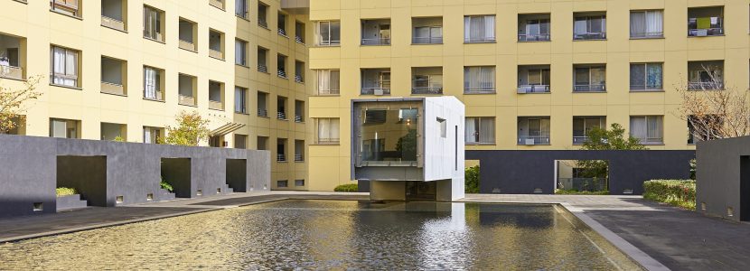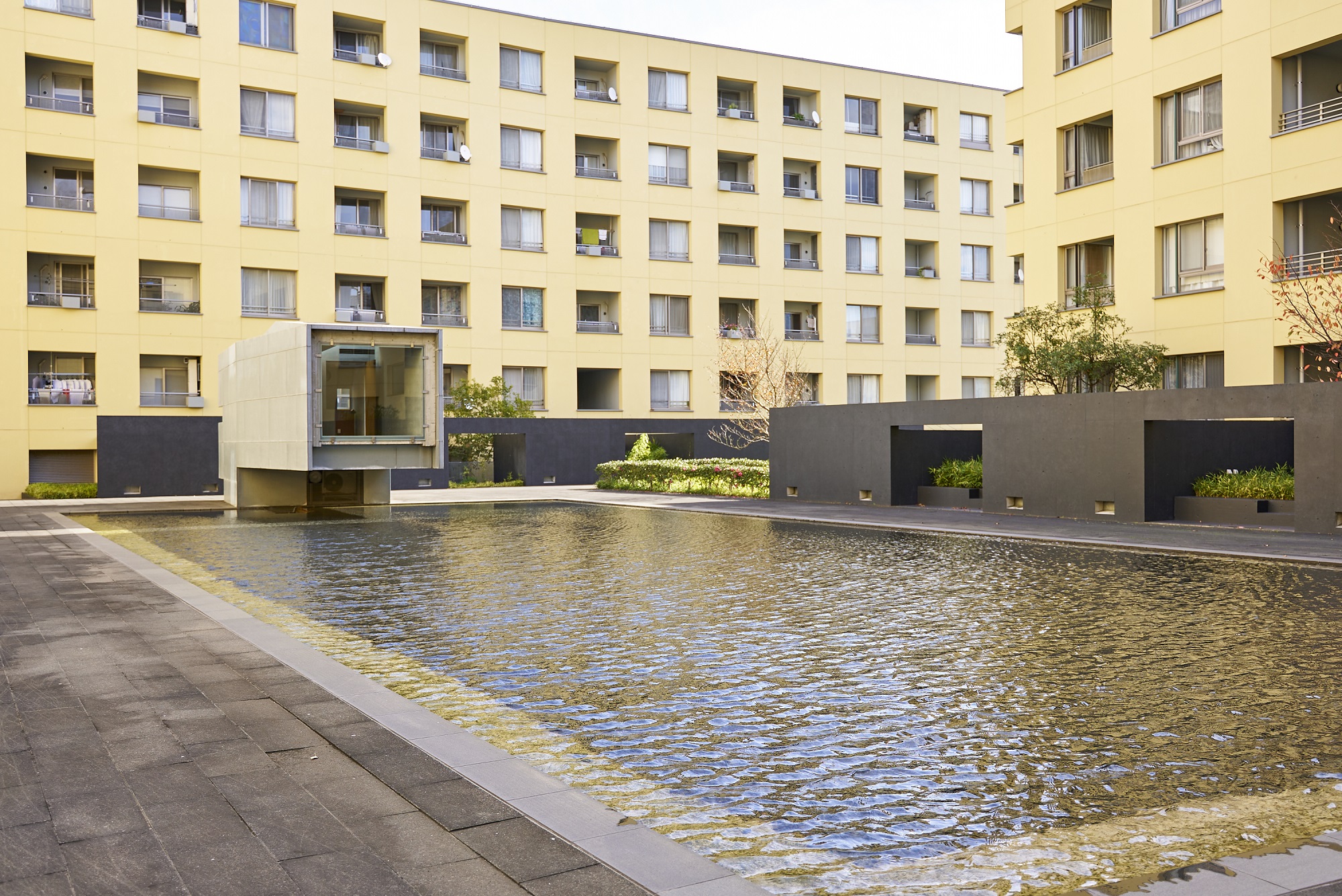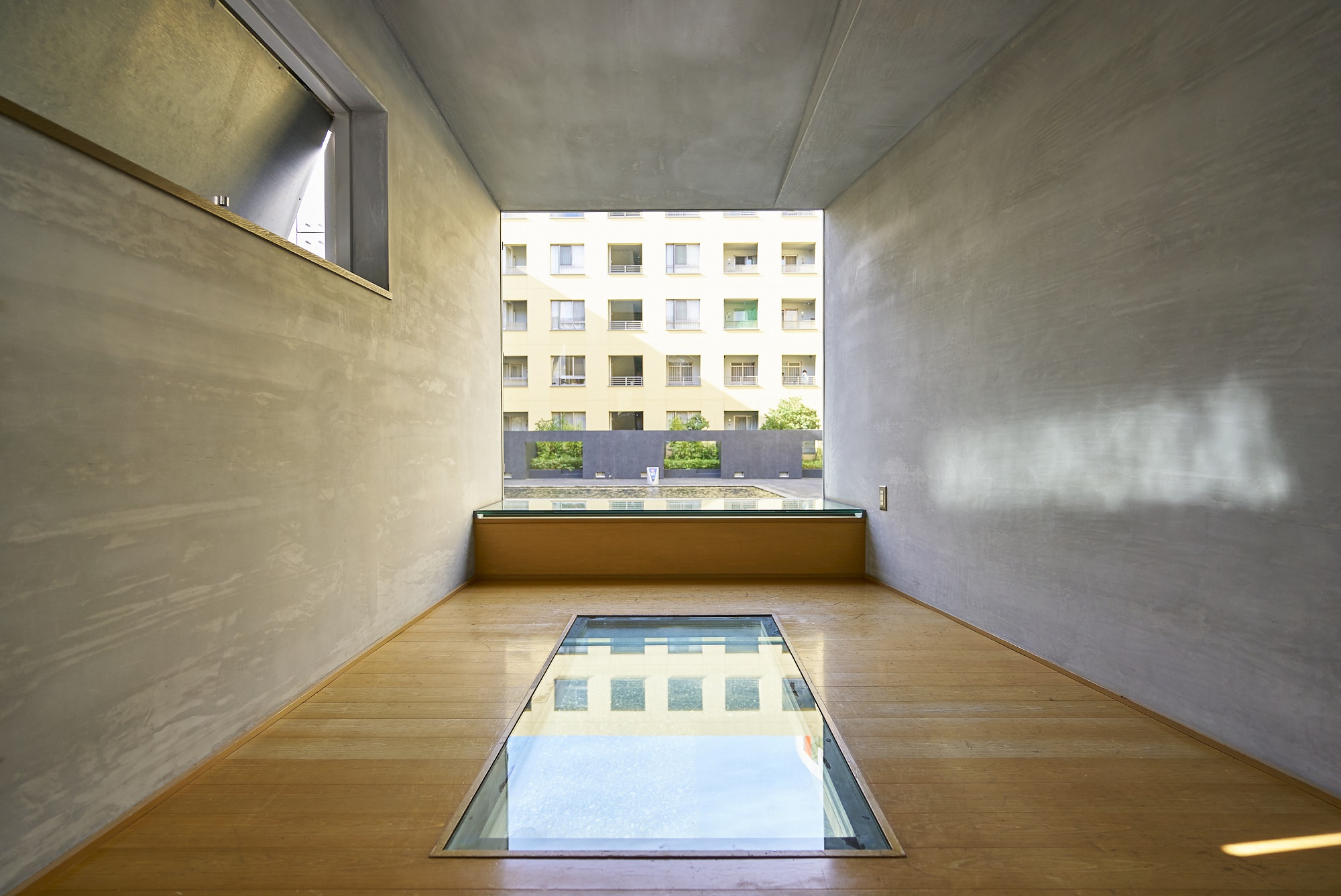 北の中庭「サンライト・スクエア」は、約12m×約26mの大きな池が中央に設けられており、水面をさざめかせる風、反射する光、無数の同心円を描く雨粒など、自然の豊かな営みを日常生活のシーンの中に鮮やかに描き出してくれます。池の上に張り出して建つ「サンライト・ハウス」は、ガラス張りの床に、水場も設られ、茶室としての趣もある空間です。