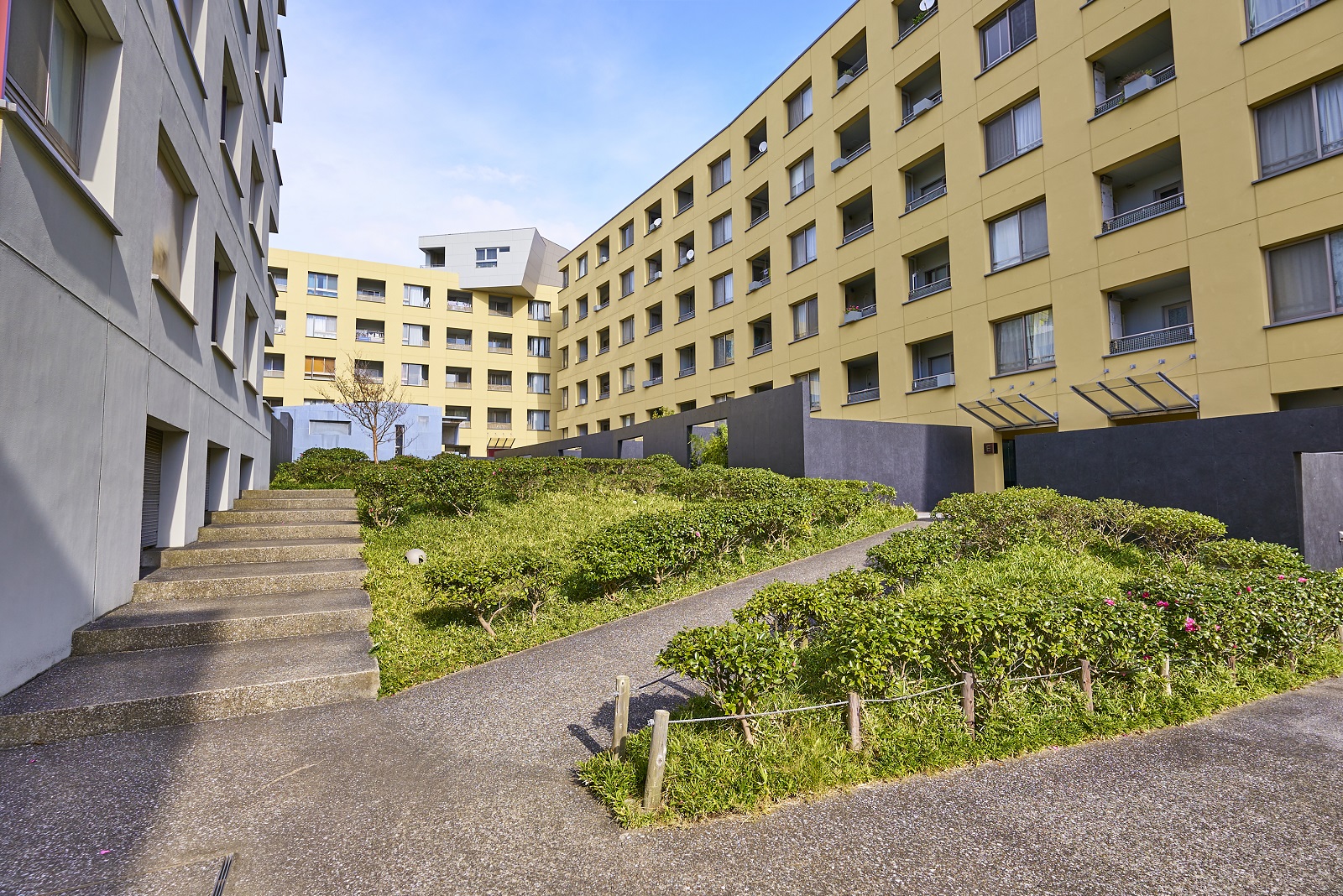 街の南の中庭「グリーン・スクエア」は、3ヵ所に設けられた緩やかなスロープによって人々を優しく導くように、街に住まう人が集い、語らい、交流するオープンなステージ。この中庭に面して街の共用施設「コミュニティハウス」が設けられ、人々に愛される、賑わいとあたたかみのある空間が創り出されています。