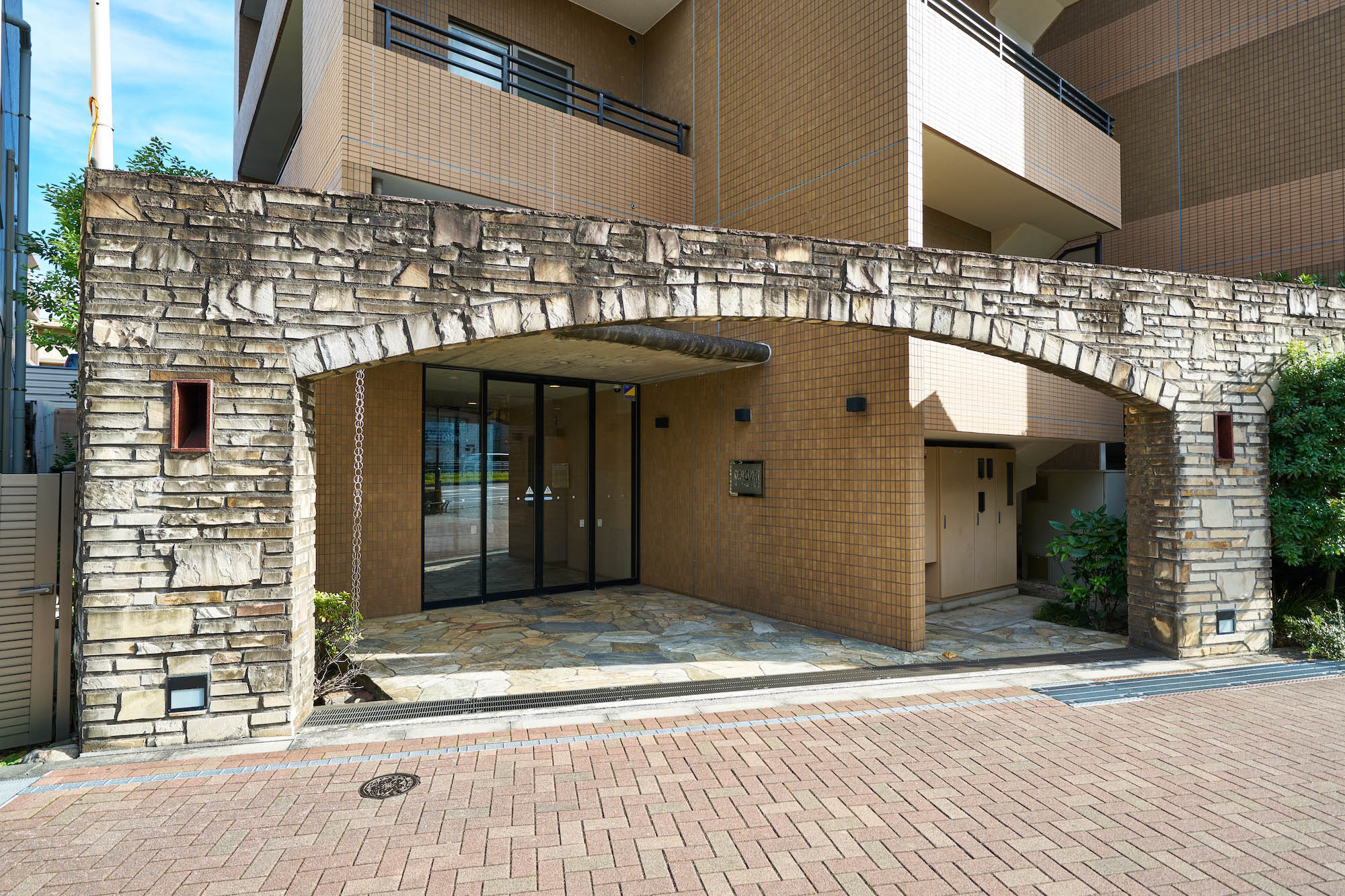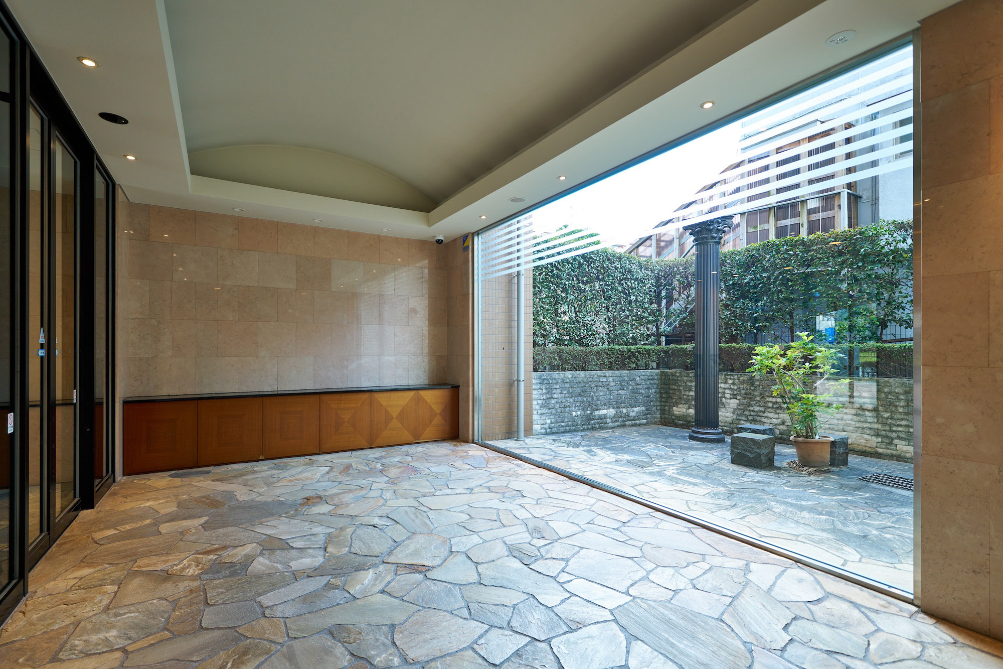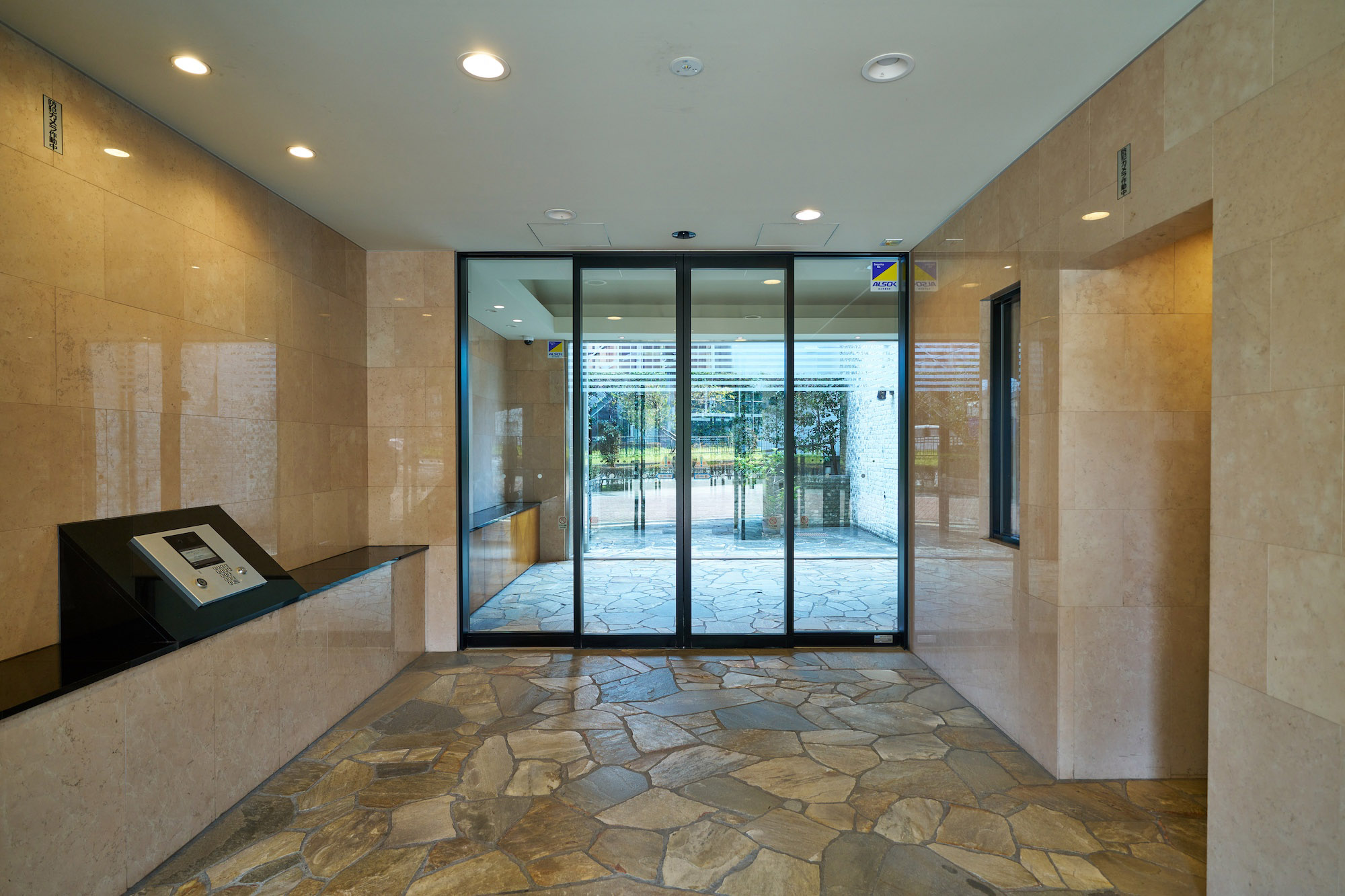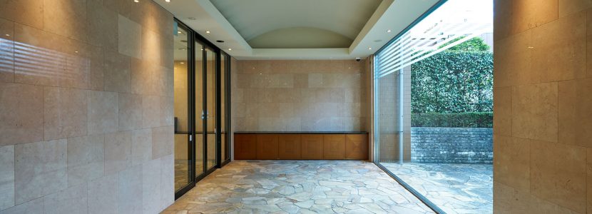 エントランスは「ほっとできる癒しのデザイン」をコンセプトに、洗練された優雅さを演出。道路際から充分な奥行きを確保したアプローチレイアウトによって、エントランスホール内部は表通りから隔離された静寂さを実現するとともに、ポーチからホールにかけては床に砂岩の乱貼りを施した高級感あふれる仕上がりとなっています。そのまま同じ仕上げに統一したカームコート(中庭)には、植栽帯をバックに古代ギリシャ風の柱のオブジェなどを配して、都心居住拠点にふさわしいアーティスティックな雰囲気を醸成。ホールからはガラス越しにその景観を望むことができます。エントランスポーチから中庭へと一直線に抜けるパースペクティブは、まるで一幅の絵画。我が家に向かうにつれて徐々に気持ちが和んでいくような、上質な空間が創り上げられています。