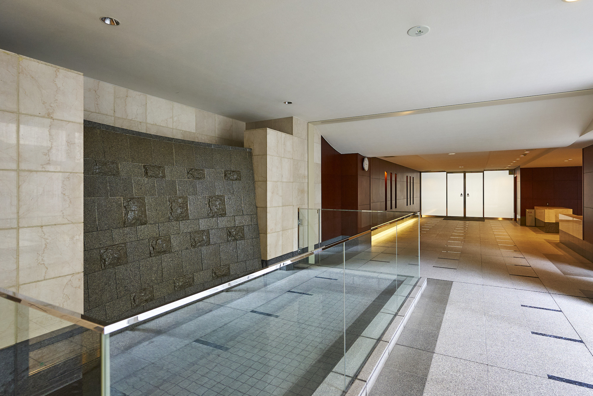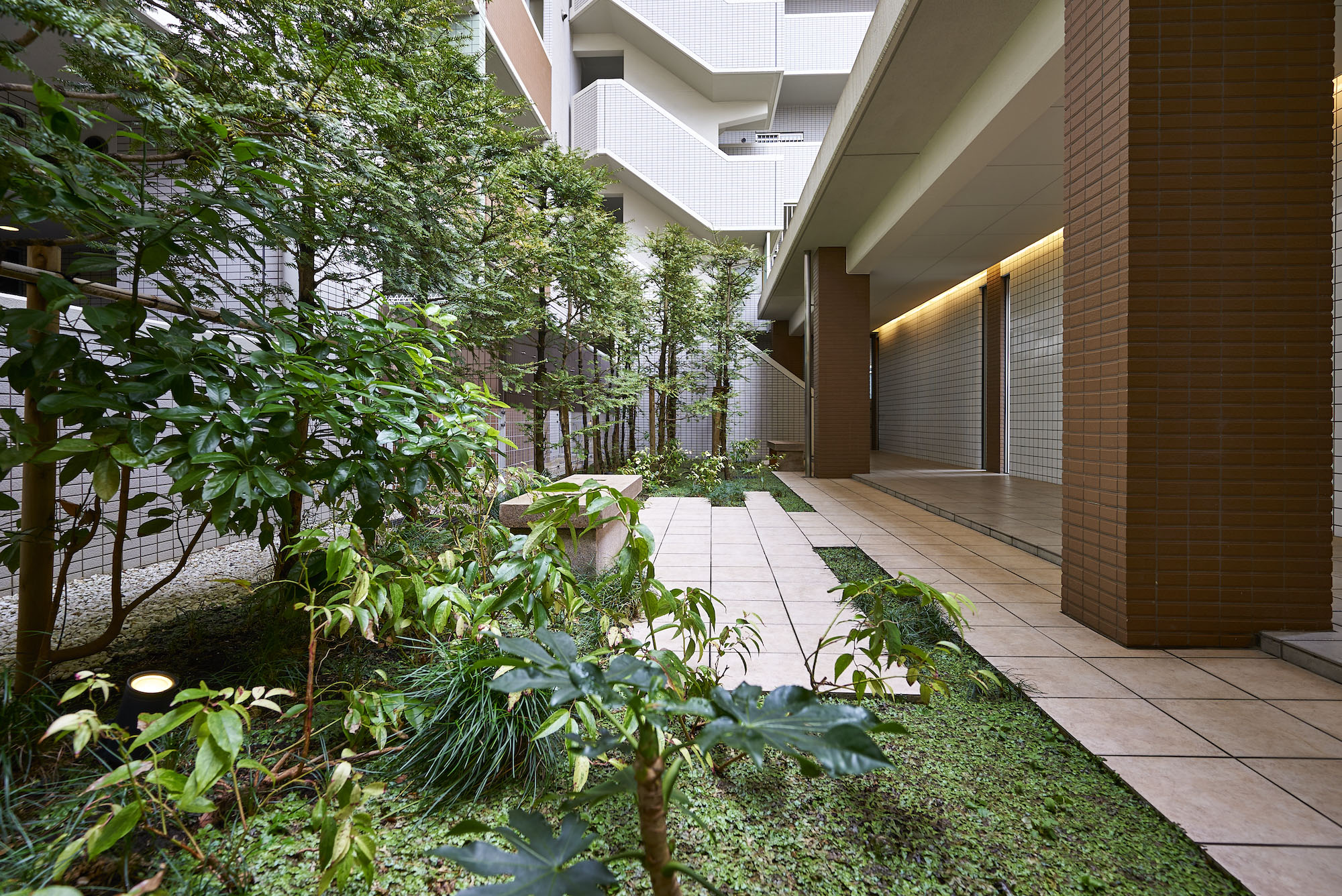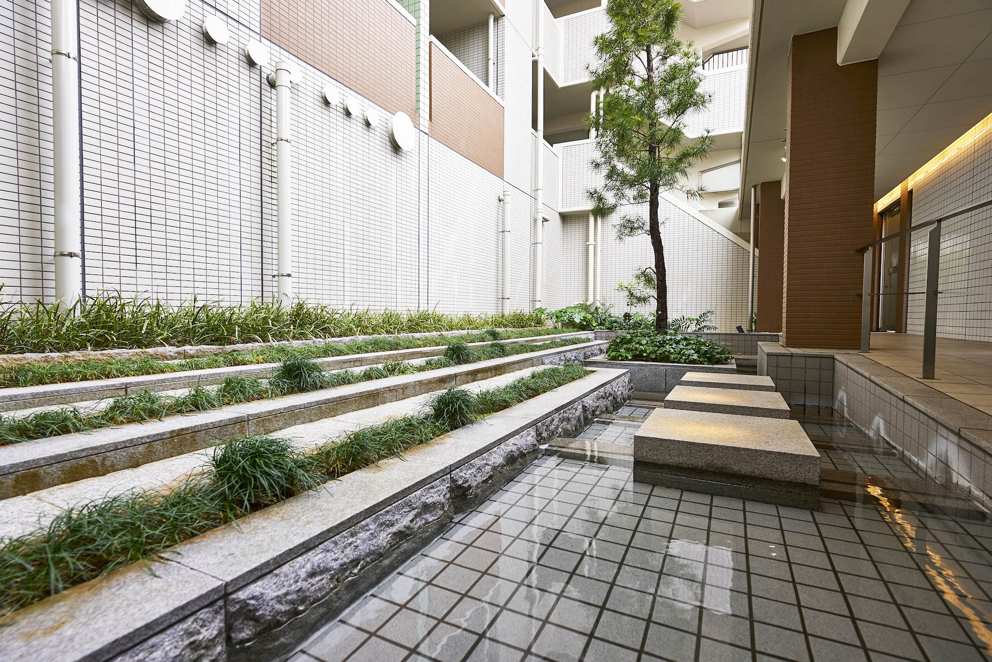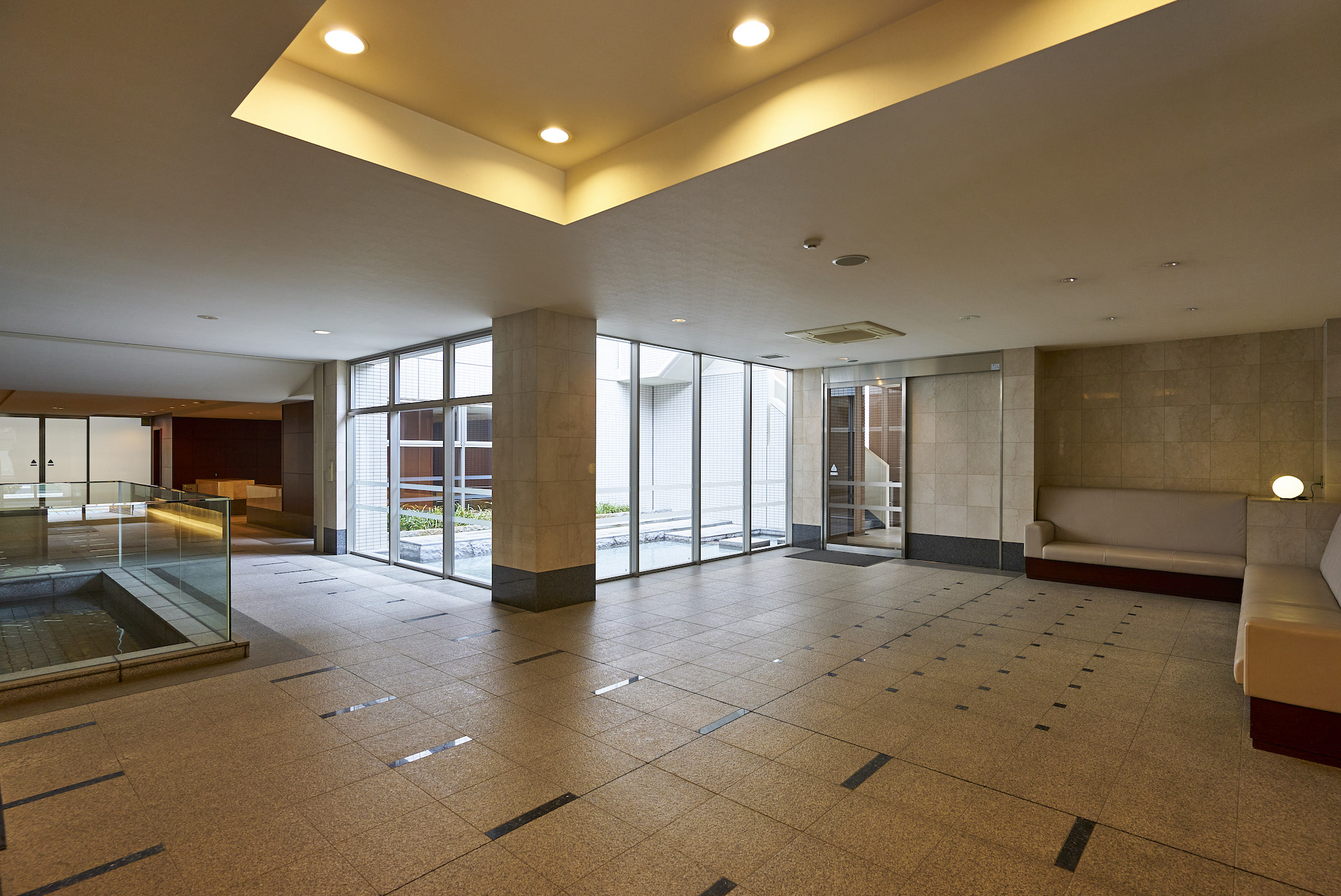 メインエントランスホールは、床に大理石、壁には御影石をあしらった、気品と風格が漂う空間です。その一角に設けられたフォーマルラウンジには、大切なゲストをお迎えするのに相応しい、落ち着きある家具がしつらえられています。中庭「せせらぎの庭」は、小川のせせらぎをテーマにした潤いあふれる空間となっており、日々の暮らしにくつろぎ感を演出してくれます。