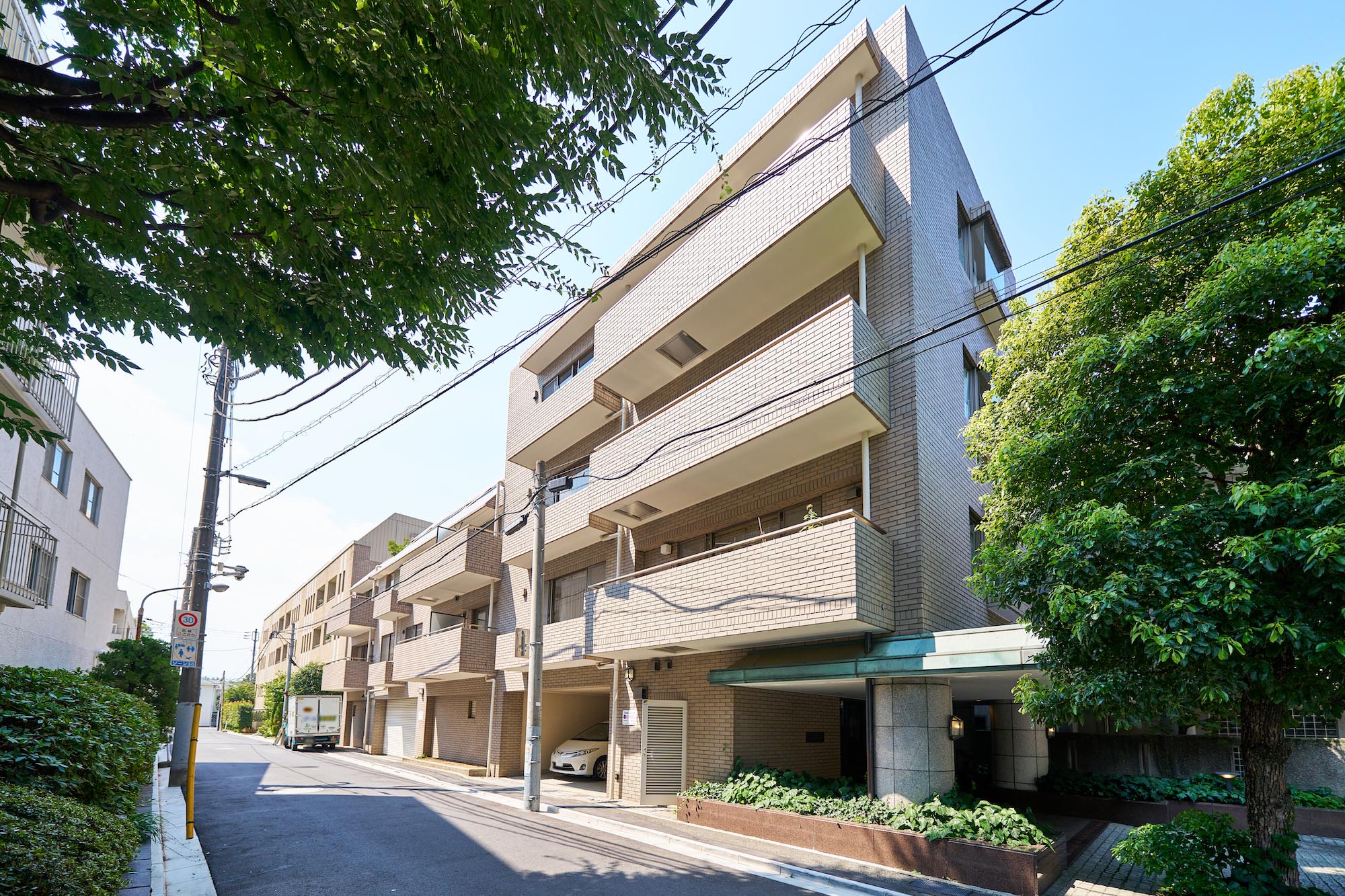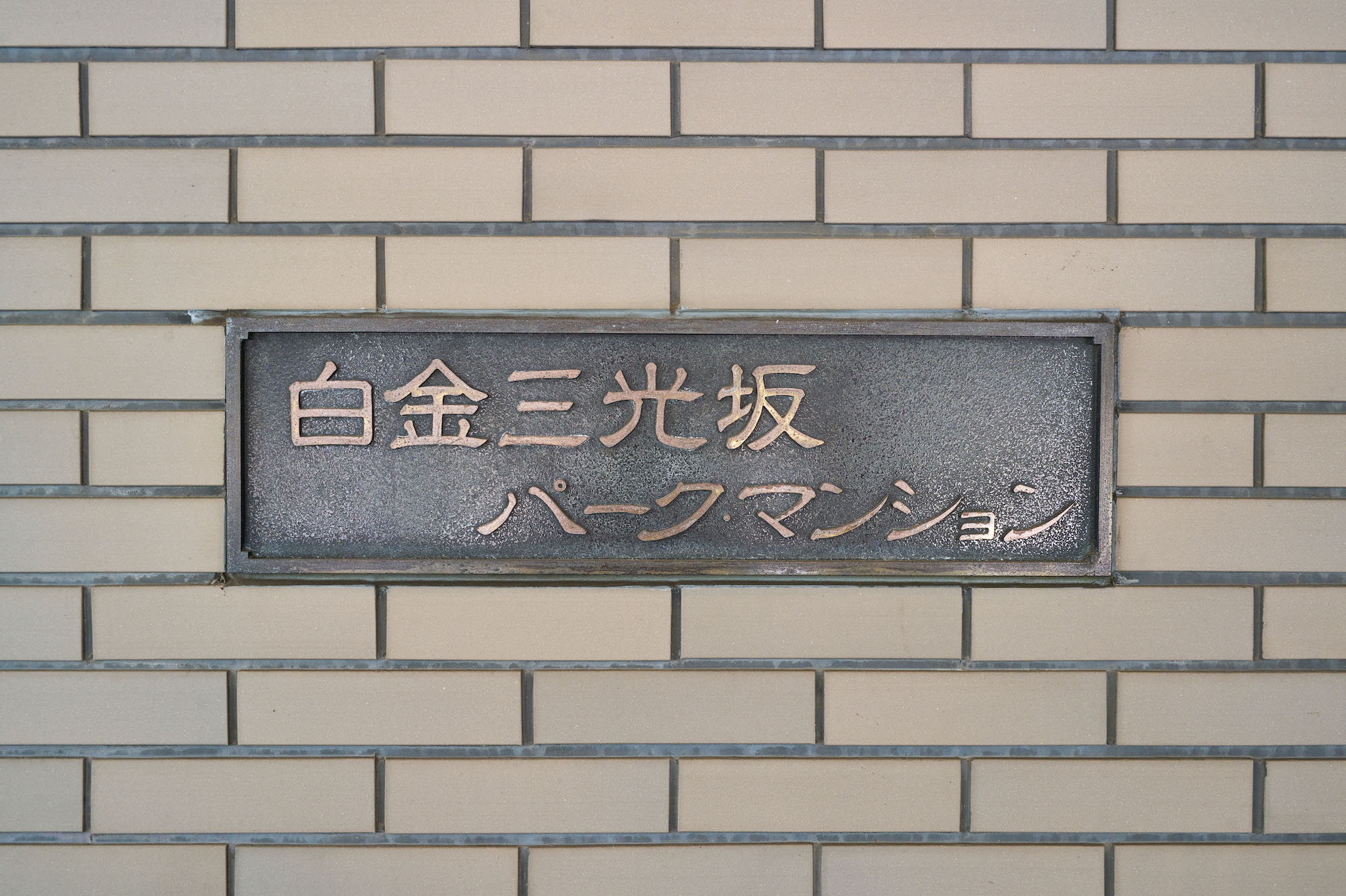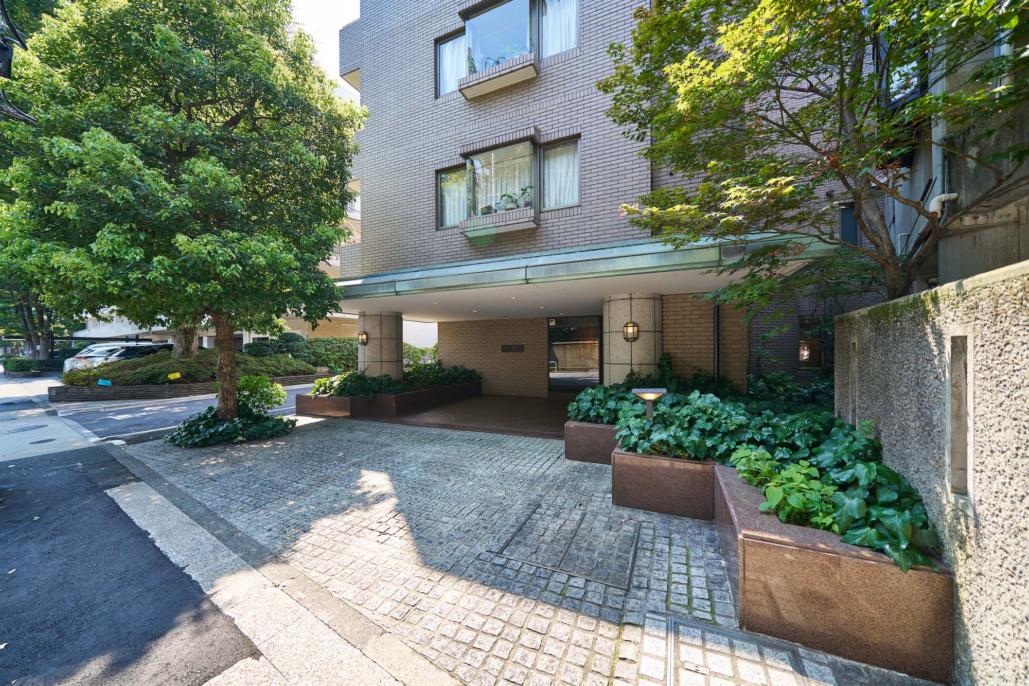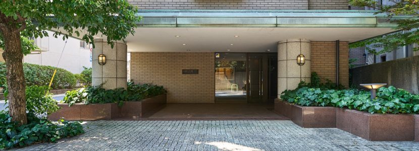 東京都港区の閑静な高級住宅街に位置する「白金三光坂パーク・マンション」。外観はシンプルなベージュのタイル貼りで、緑青色の大庇が印象的な、上品で優しい佇まいです。建物全体からは重厚感と落ち着いた雰囲気が漂い、周囲の鮮やかな植栽とのコントラストが美しい景観を生み出しています。