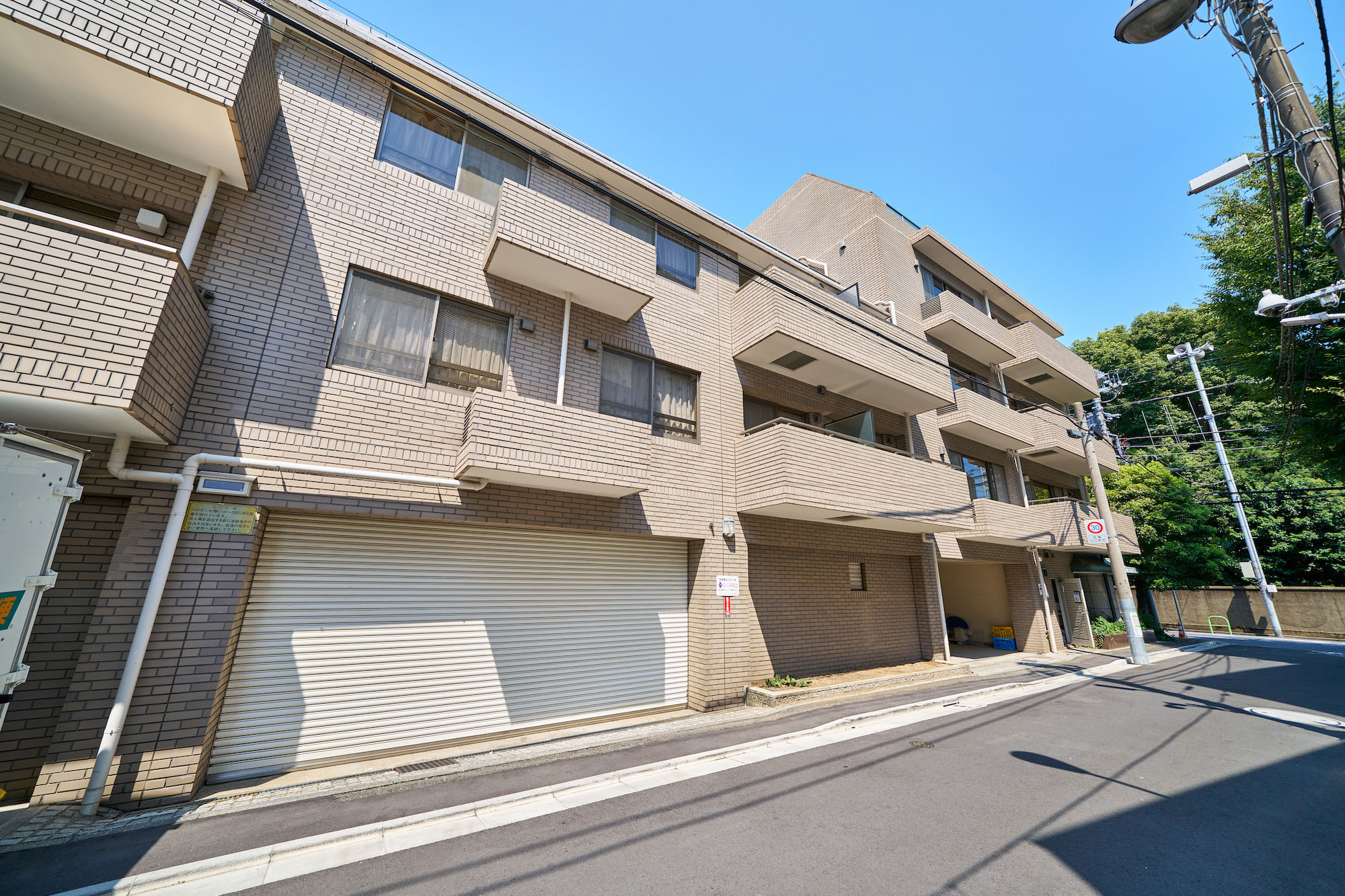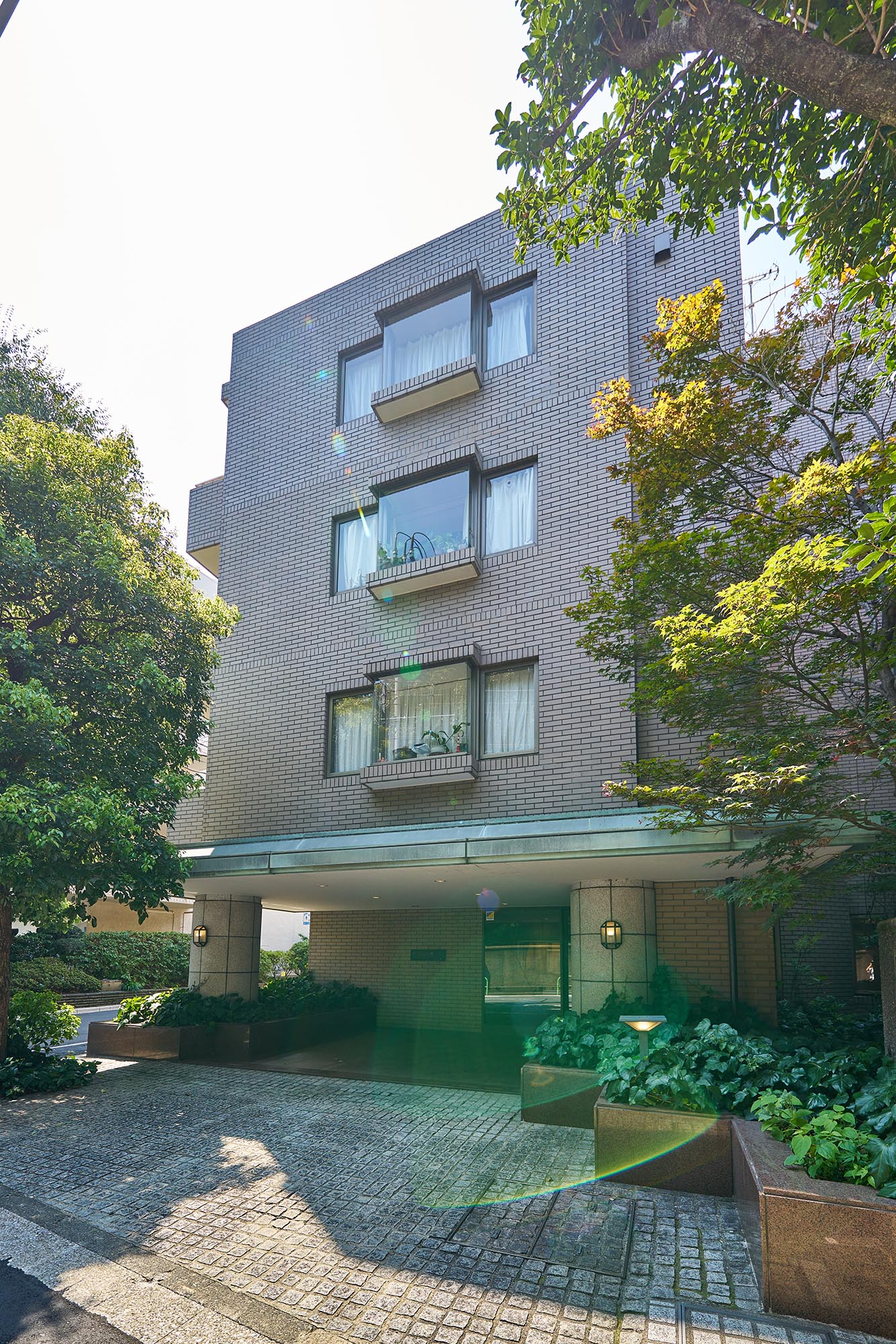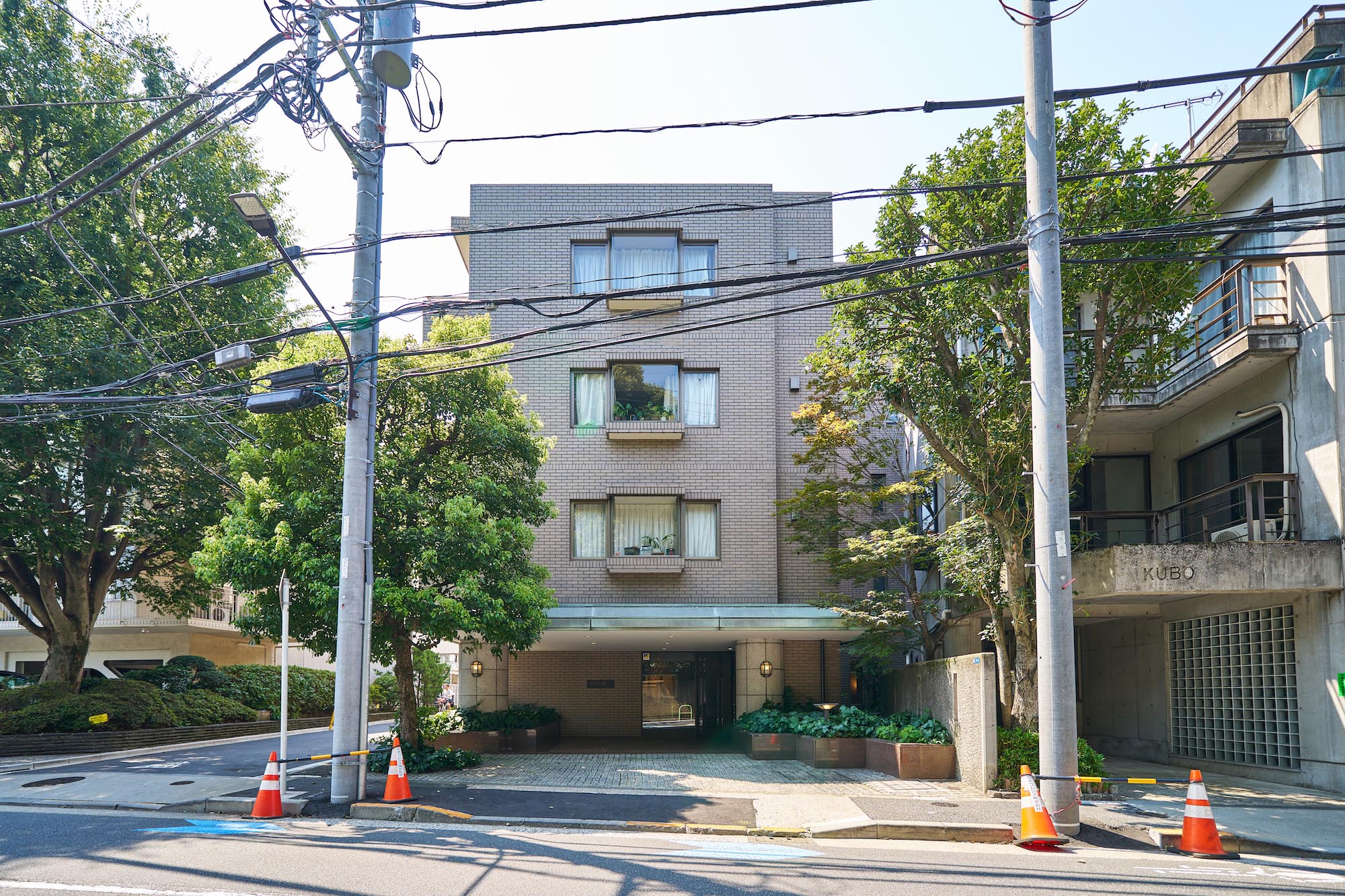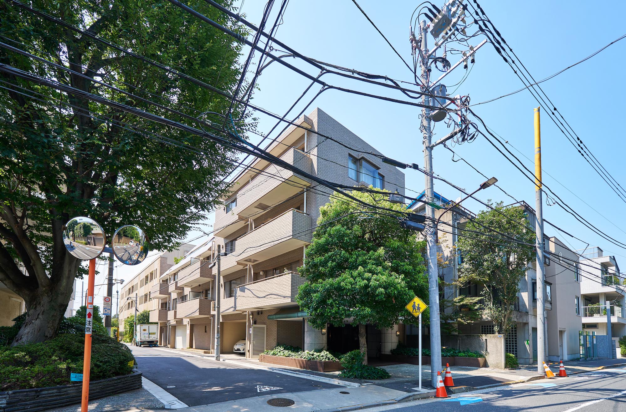東京都港区の閑静な高級住宅街に位置する「白金三光坂パーク・マンション」。外観はシンプルなベージュのタイル貼りで、緑青色の大庇が印象的な、上品で優しい佇まいです。建物全体からは重厚感と落ち着いた雰囲気が漂い、周囲の鮮やかな植栽とのコントラストが美しい景観を生み出しています。