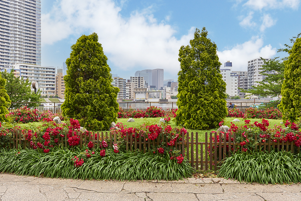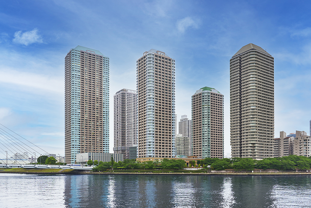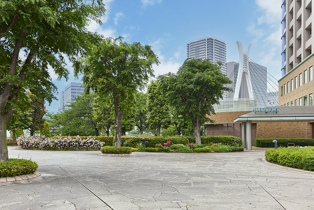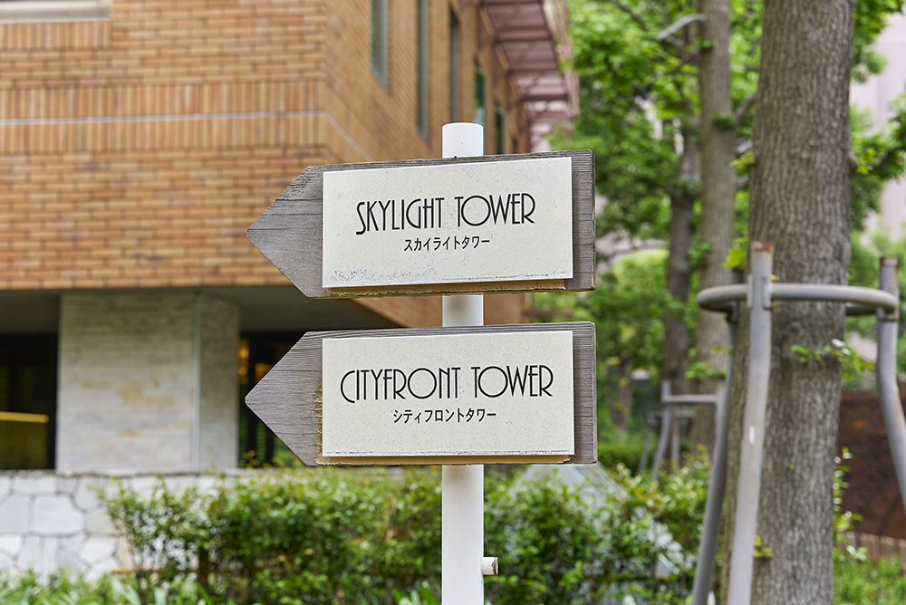 「スカイライトタワー」は、東京ウォーターフロント開発の先駆けとなったプロジェクト「リバーシティ21」の一角に聳え立ちます。“水と緑にあふれた都市景観の創造”をテーマに、計画数約1,170戸、約3haにおよぶ敷地は歩車分離とし、あくまでも人が中心の街づくりが実施されました。四季折々の緑が楽しめる植栽プランを全体に配し、区立佃公園をはじめとする川沿いに設けた公園とトータルにコーディネイトされ、うるおいの居住環境を生みだしています。