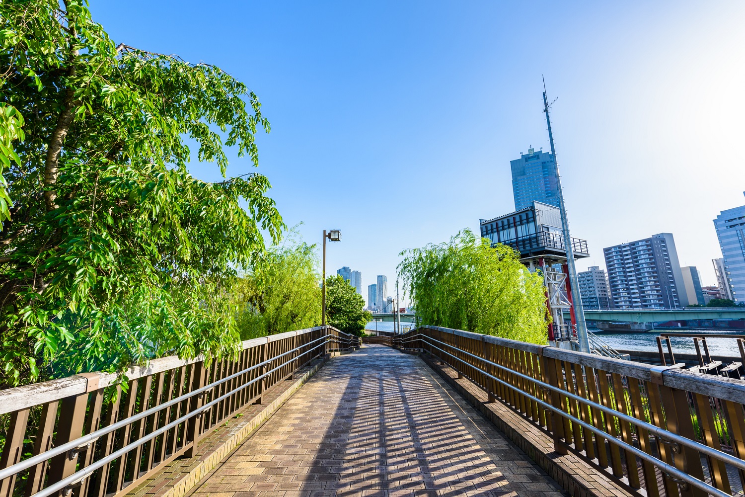 昔ながらの文化、風景を残す下町情緒が残る街。「月島」駅から徒歩6分、隅田川沿いに位置する「スカイライトタワー」は、生活施設と公園が充実していて、子育てしやすい場所です。東京駅から約2km圏内の立地条件で、日本橋エリアや銀座エリアに徒歩・自転車で通える立地にあり、周辺にはスーパーや保育園、フィットネス、郵便局などが整備されています。