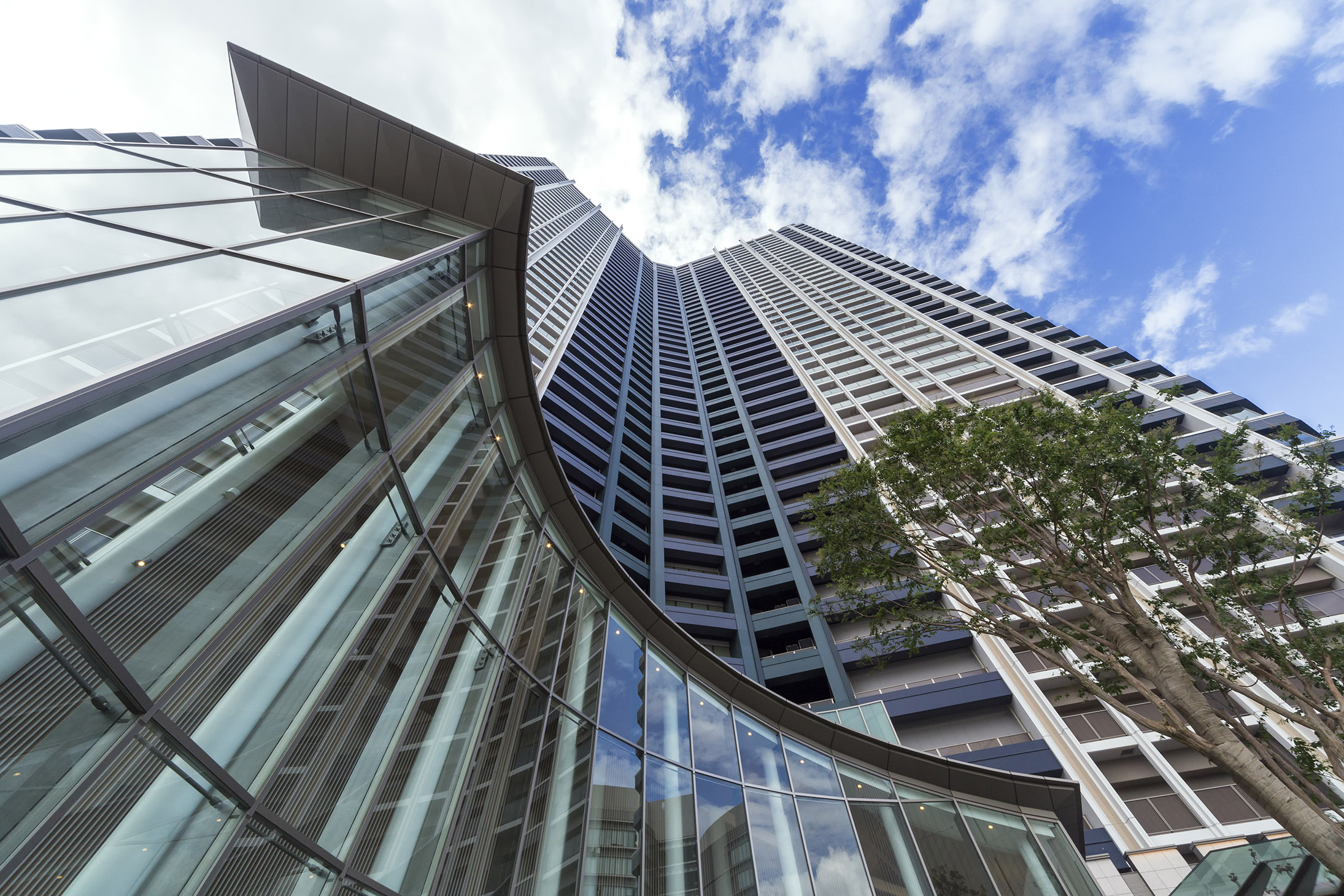 白を基調とし、ガラスや金属などシャープな素材を組み合わせた爽やかで透明感のある表情。縦に伸びる大小のマリオンは、高々と空へと向かう上昇感を演出。また、アウトフレームとインナーフレームを巧みに使い分け、色彩による分節表現と壁面のセットバックにより、壮大な建築をシャープで軽やかに見せています。最上部には、3つのタワーが寄り添いひとつになったトライスターデザインの象徴として、3つのウィングそれぞれの頭上に軽やかで壮観なフィンをデザイン。このタワーの存在感を美しく高めています。