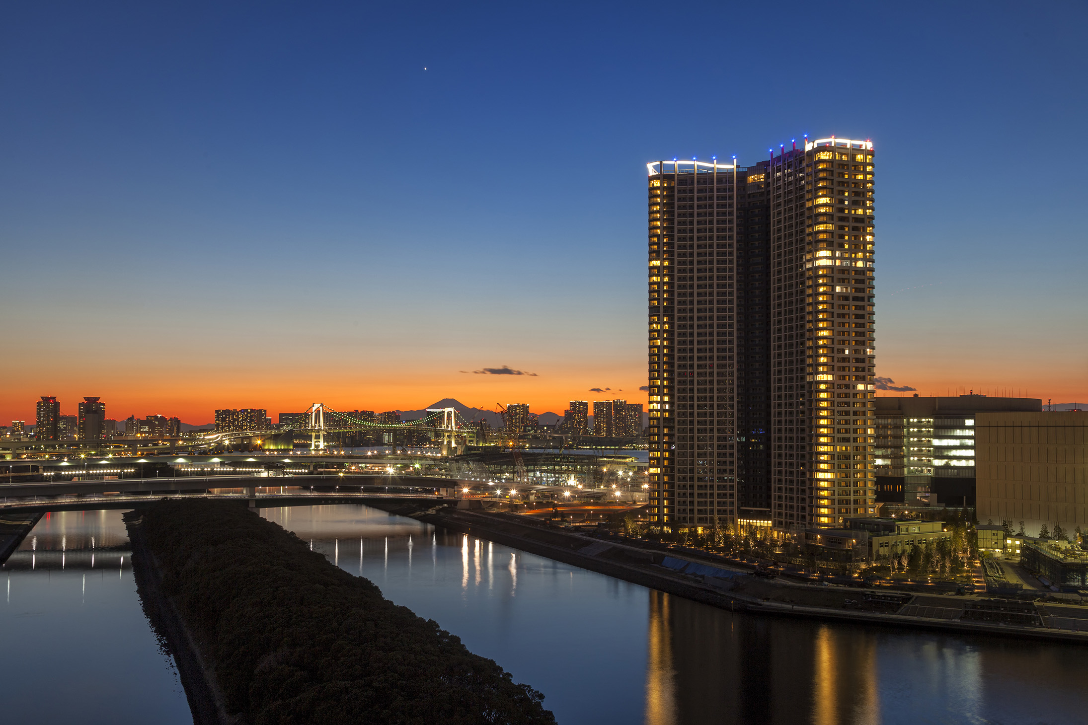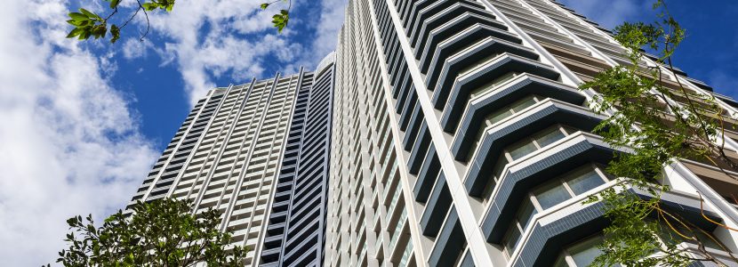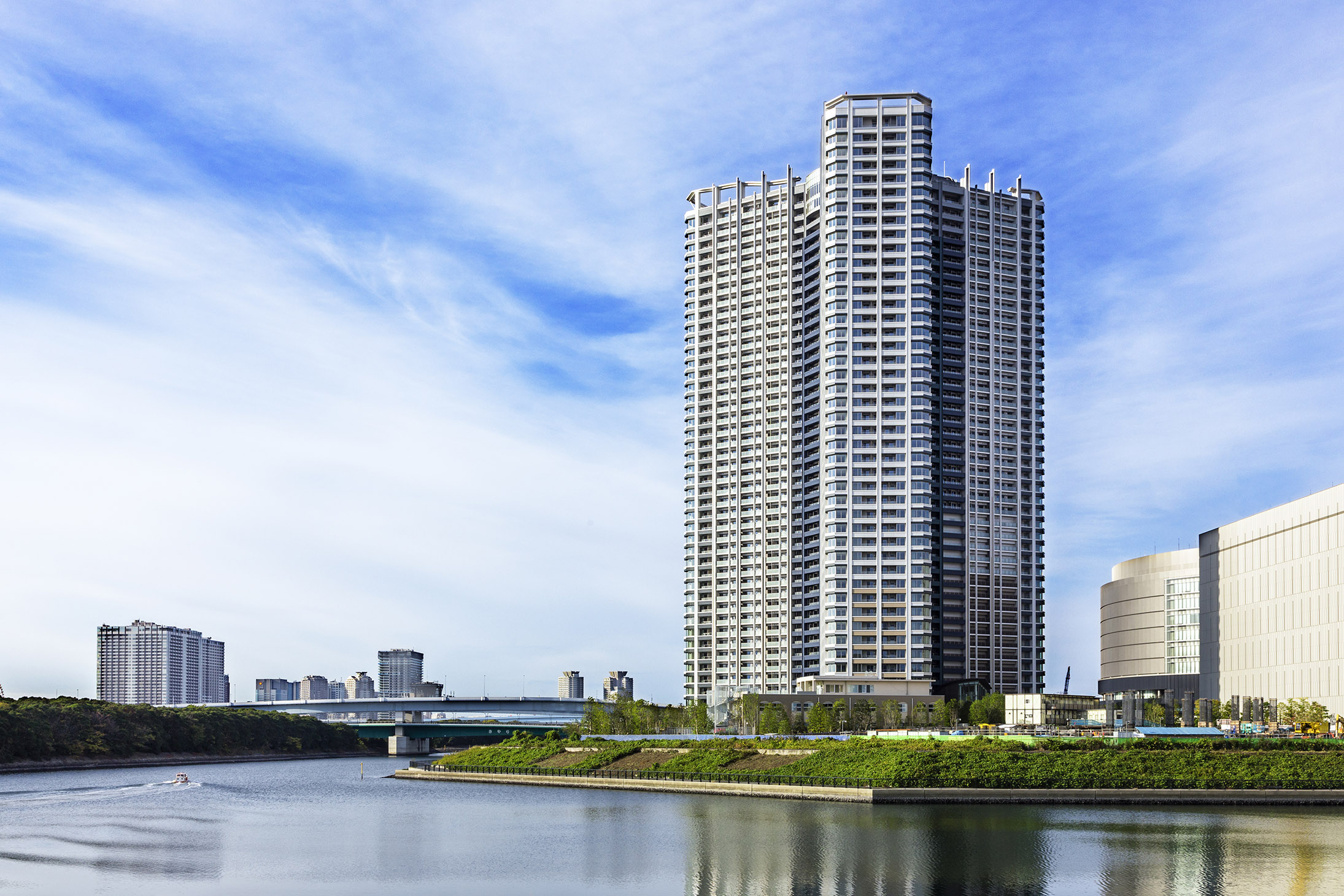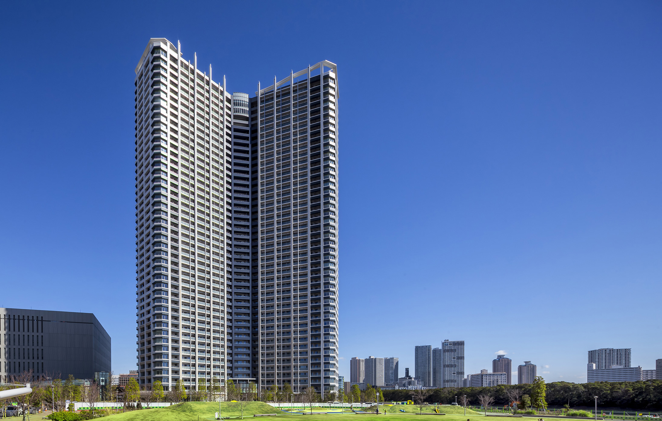 白を基調とし、ガラスや金属などシャープな素材を組み合わせた爽やかで透明感のある表情。縦に伸びる大小のマリオンは、高々と空へと向かう上昇感を演出。また、アウトフレームとインナーフレームを巧みに使い分け、色彩による分節表現と壁面のセットバックにより、壮大な建築をシャープで軽やかに見せています。最上部には、3つのタワーが寄り添いひとつになったトライスターデザインの象徴として、3つのウィングそれぞれの頭上に軽やかで壮観なフィンをデザイン。このタワーの存在感を美しく高めています。