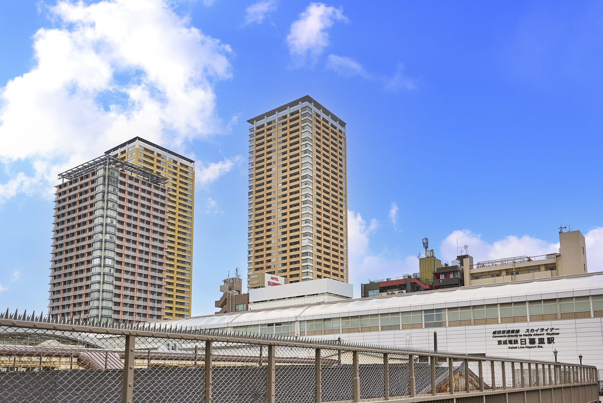 低層階はシックなブラウン系のタイル、高層階は柔らかな色合いのオレンジ系のタイルを使用した、明るく優しい印象の外観。駅前のタワーの中でも最も高く、かつスマートなフォルムで、空へと伸びる美しい姿を描いています。にぎわう街に調和しながら、遠くからでもその存在感を放つ、山手の駅前ランドマークに相応しいデザインです。
