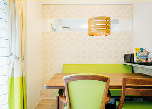 住まいを選ぶ際に外せなかった条件が、横長のリビング。ウッドと淡いグリーンの家具で明るさが演出されたインテリアは、奥様がコーディネートされたとのこと。隣室のプレイルームには、絵本や児童書など大量の本が壁一面を覆う大きな本棚に収められている。