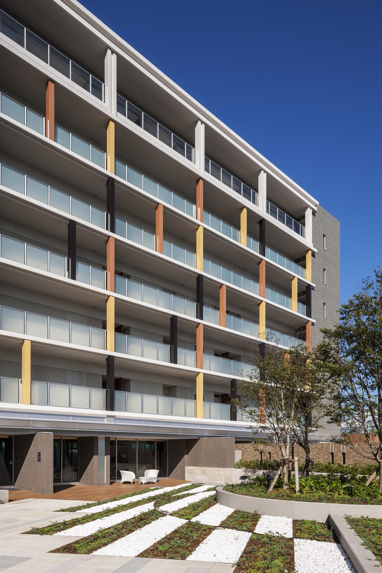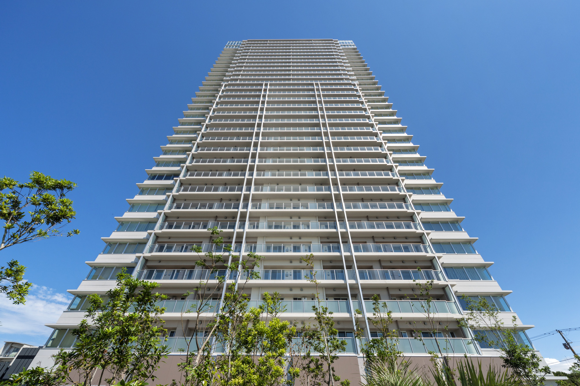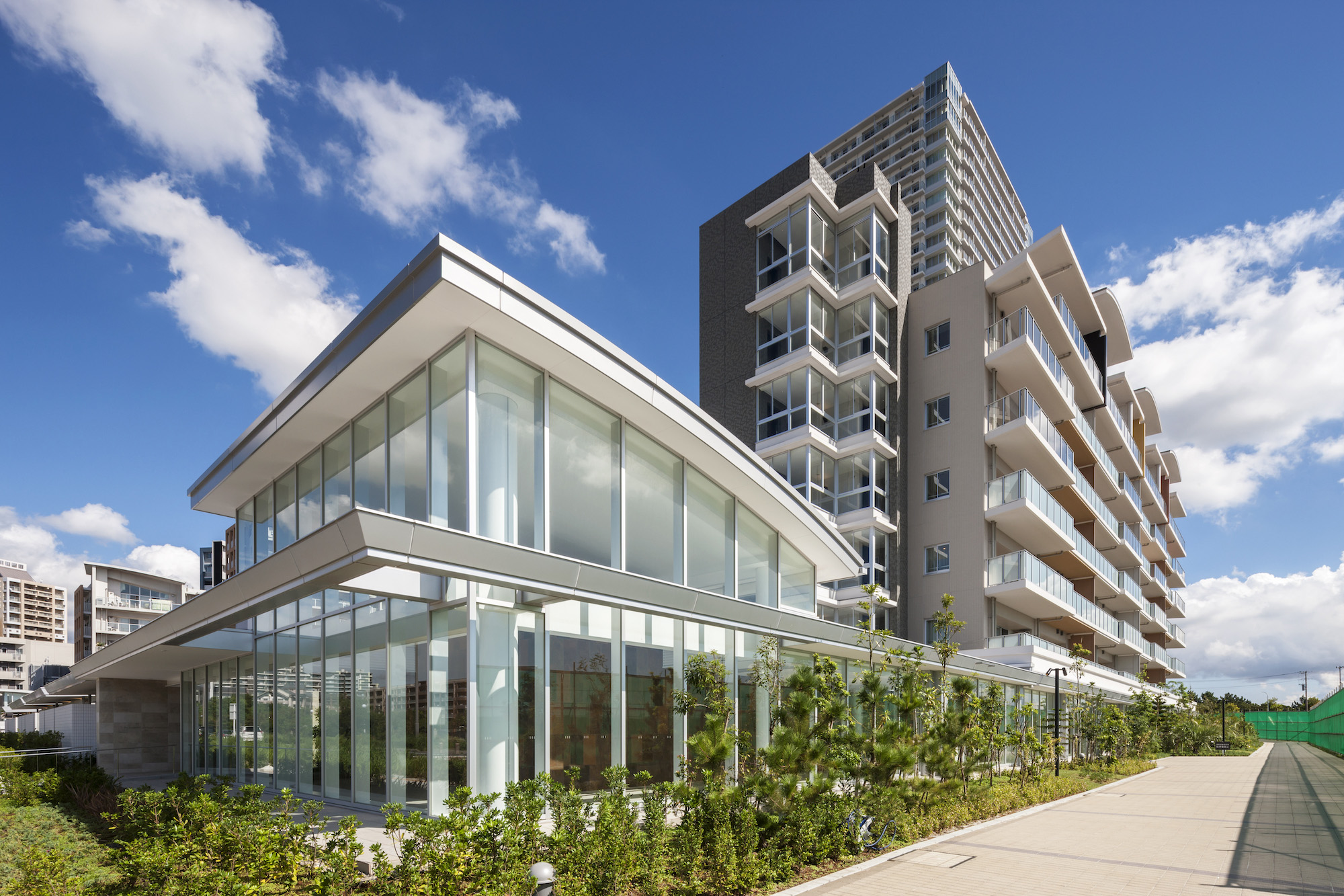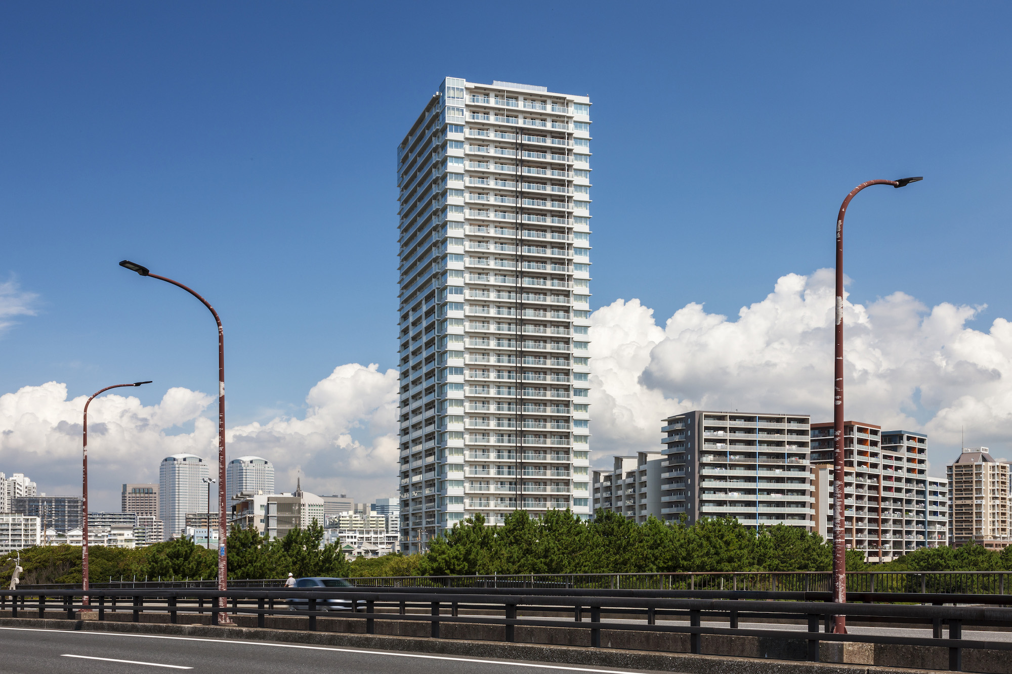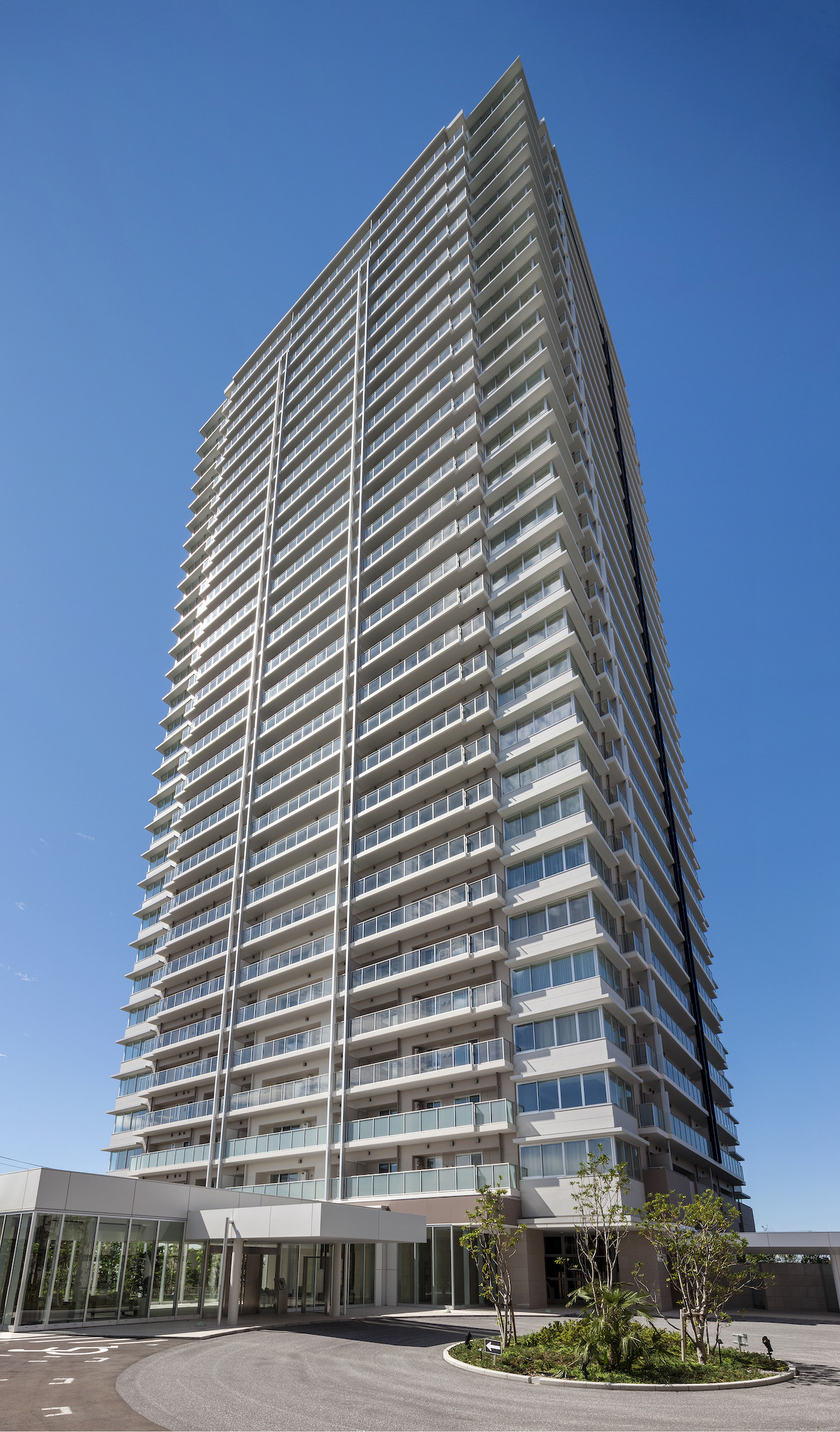 31階建のタワー棟は、都市軸の表現と、垂直性を意識した端正なプロポーションを追求。幕張の街に於ける建築としての在り様と、住まいとしての性能を兼ね備えた意匠を実現しています。レジデンス棟は、「幕張ベイリゾート」をコンセプトに、船の帆をイメージしたスカイラインや質感のあるマテリアルなどを採用。トップレジデンスのハイルーフや水平に広く張り出したバルコニーが、海からの風と太陽の光を伸びやかに受け取る空間を感じさせます。