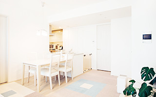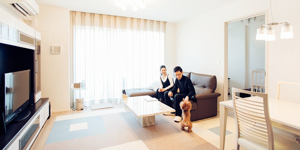 以前は東京都心にお住まいだったが、子育てなどこれからの「家族の在り方」を考え、広々と伸びやかな開放感を重視して、住まいも周辺環境も決められたSさんご夫婦。特に海が近いことにはこだわられたそう。内装の白に合わせて家具や家電なども白を基調とし、愛犬ココちゃんのために敷いたタイルカーペットも優しい色合いをうまく組み合わせたことで、穏やかで落ち着きのある心地良い空間となっている。