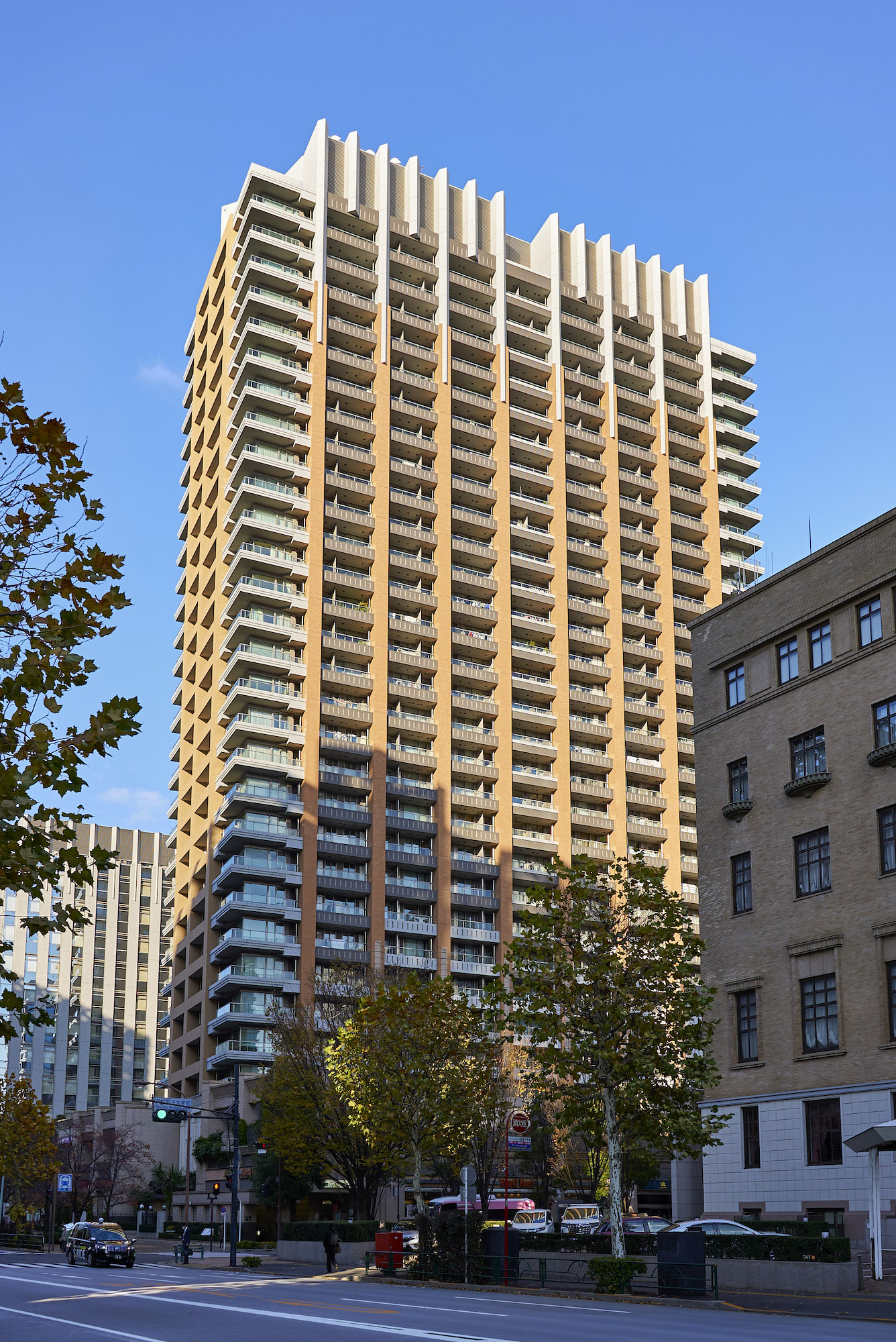 高さ約12mもの風格ある石造りの列柱でタワーを囲む基壇部は、くり型のついた梁型や鉄の装飾アイアンワークスなど伝統的な建築モチーフが取り入れられ、歴史ある街並みと融合するデザインに。石材には御影石やライムストーンといった天然素材が使用され、時間が流れるほどに味わいを深める風景を描きます。真っ直ぐに立ち上がる柱型が超高層らしい伸びやかさを印象づける中・高層部は、煉瓦色を基本色とし上部を白色系に変化させ、三角形に張り出した形状とすることで、伝統から未来へと続くイメージを表現。そして高さ約100mの最上部には、伝統とモダンの融合を象徴するティアラがライトアップされ、東京の夜空の中心に美しく浮かび上がります。