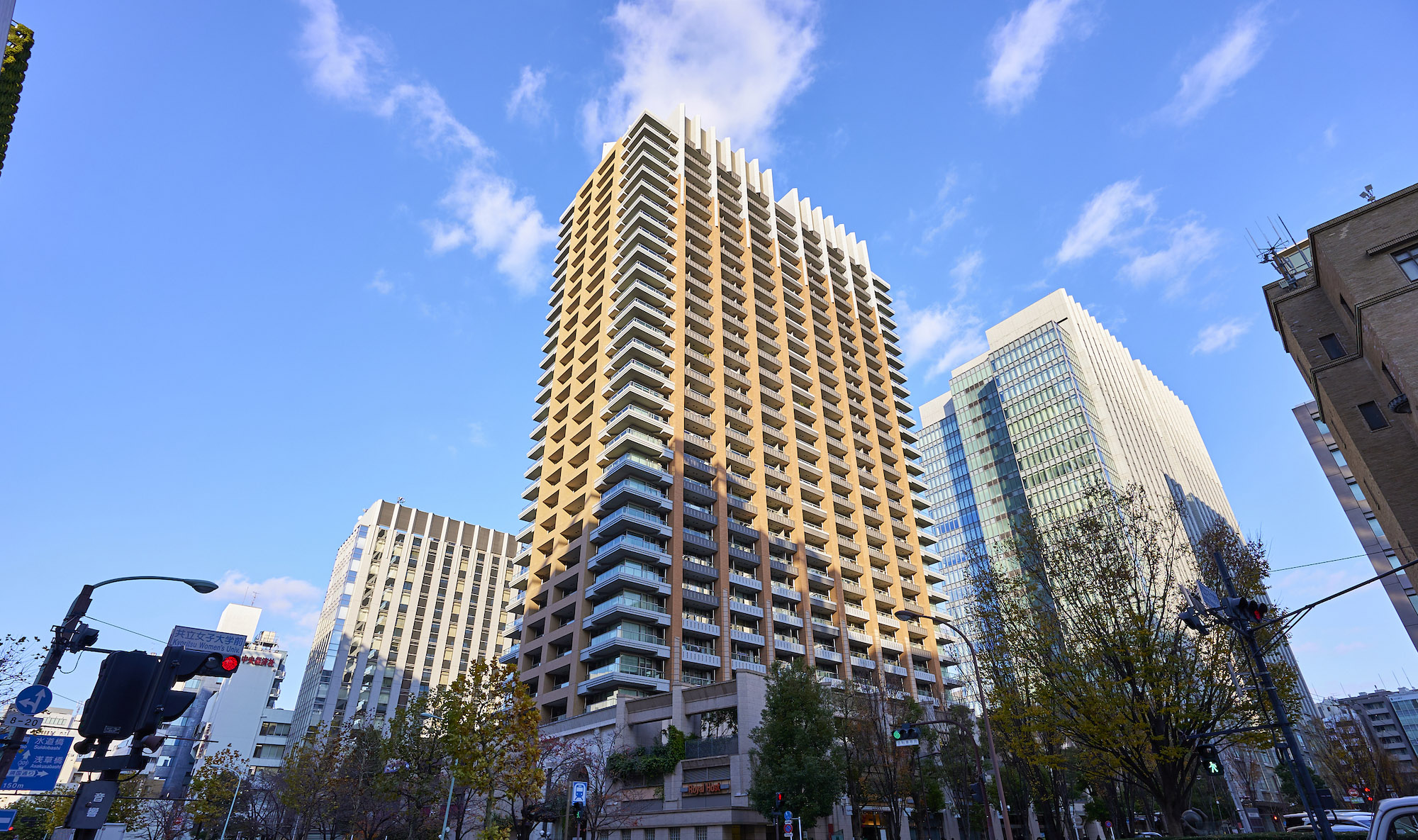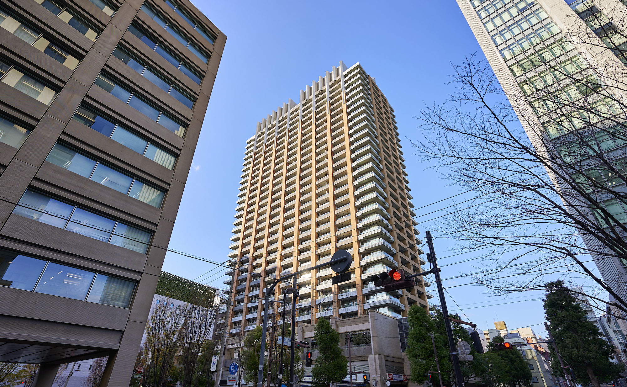 高さ約12mもの風格ある石造りの列柱でタワーを囲む基壇部は、くり型のついた梁型や鉄の装飾アイアンワークスなど伝統的な建築モチーフが取り入れられ、歴史ある街並みと融合するデザインに。石材には御影石やライムストーンといった天然素材が使用され、時間が流れるほどに味わいを深める風景を描きます。真っ直ぐに立ち上がる柱型が超高層らしい伸びやかさを印象づける中・高層部は、煉瓦色を基本色とし上部を白色系に変化させ、三角形に張り出した形状とすることで、伝統から未来へと続くイメージを表現。そして高さ約100mの最上部には、伝統とモダンの融合を象徴するティアラがライトアップされ、東京の夜空の中心に美しく浮かび上がります。