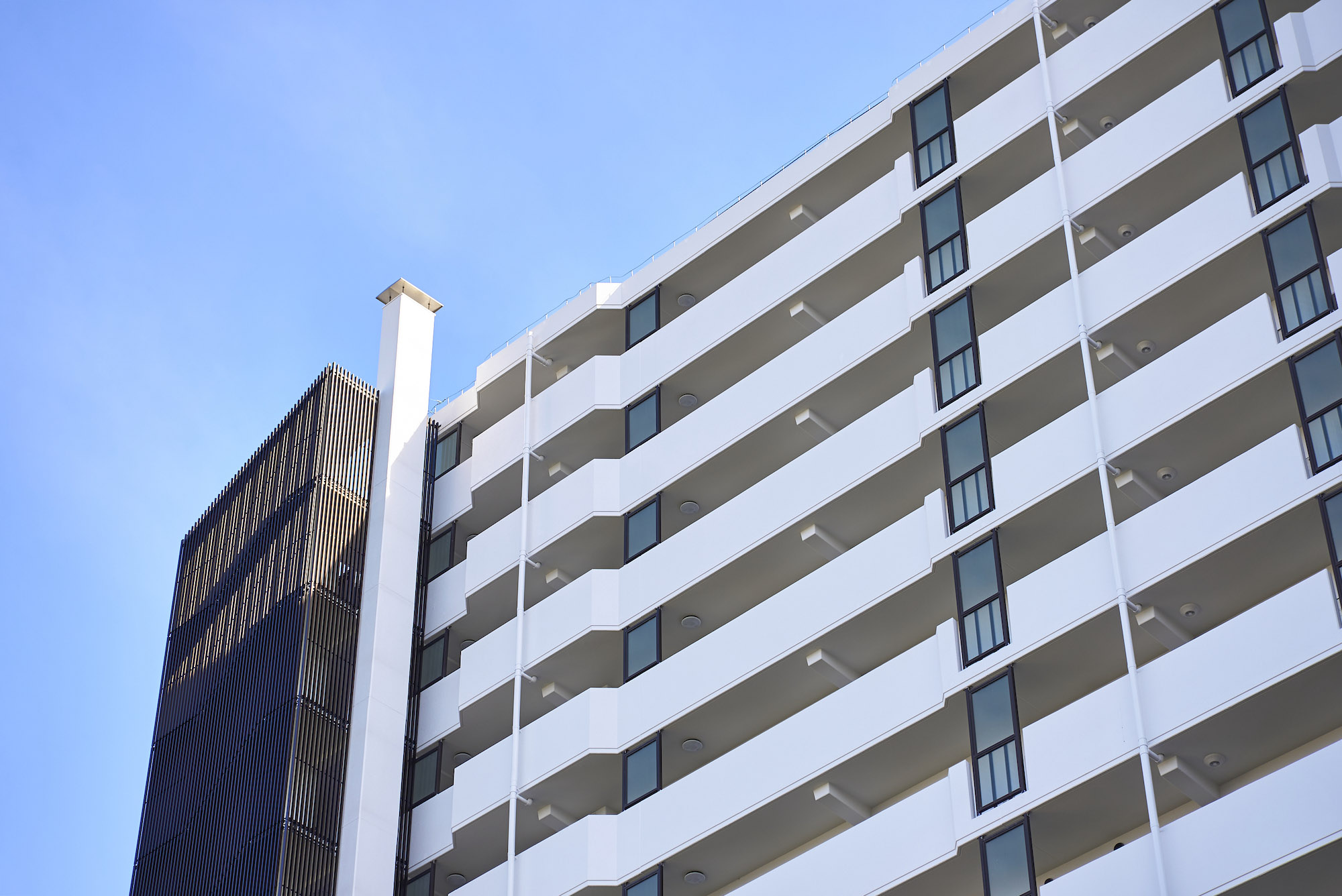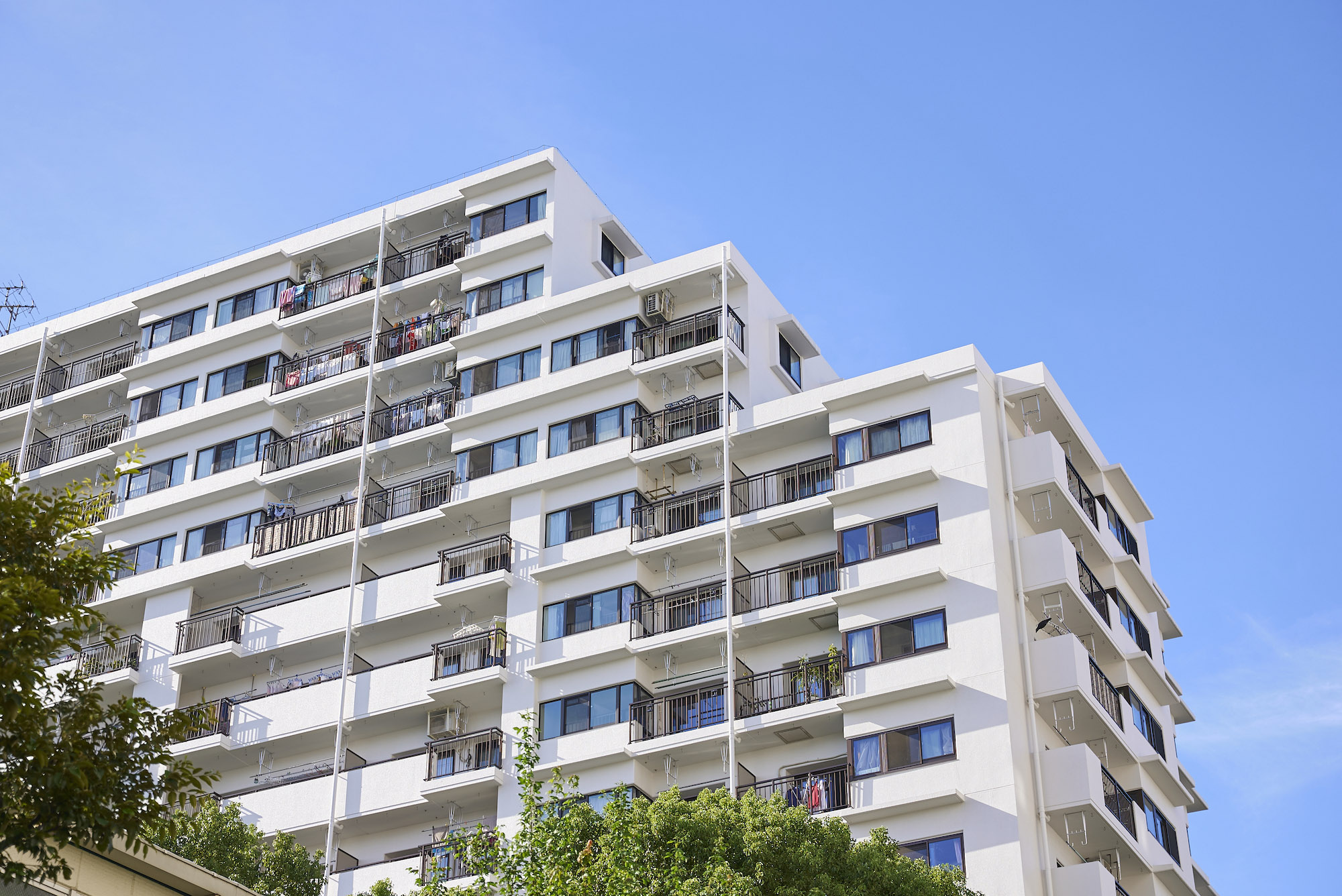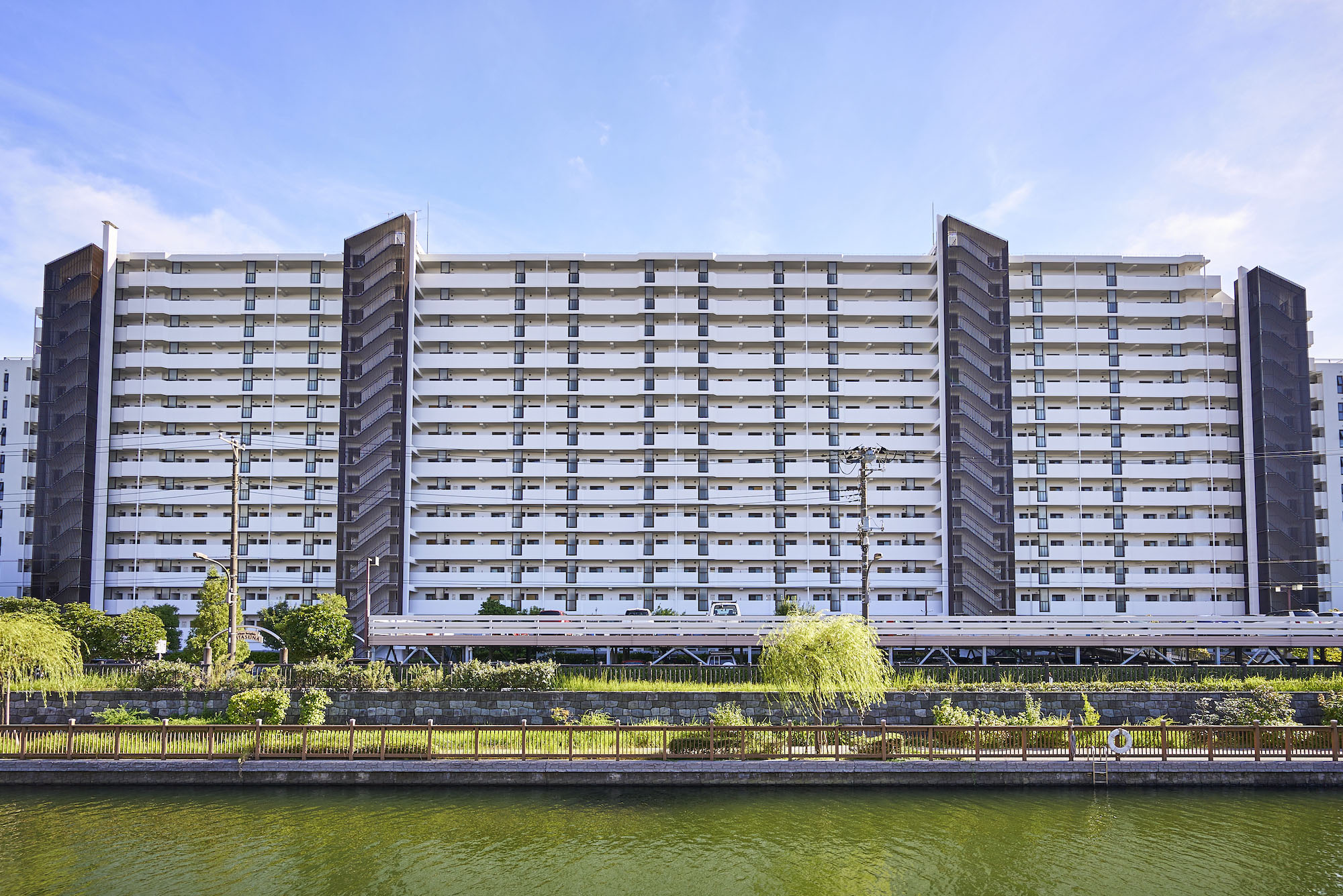 小名木川沿いに位置する「アーバンハイツ北砂」は、地上15階建て、総戸数304戸の大規模レジデンスです。全戸南向きで、南側は区立中学校のため、日当たりが良く眺望が抜けています。外観は白を基調とし、堂々としたフォルムで落ち着きある佇まいです。白い外壁は大規模修繕を経て、美しく青空に映えています。敷地内には植栽も多く、丁寧に整備されており、緑と潤いの溢れる穏やかな雰囲気が漂っています。