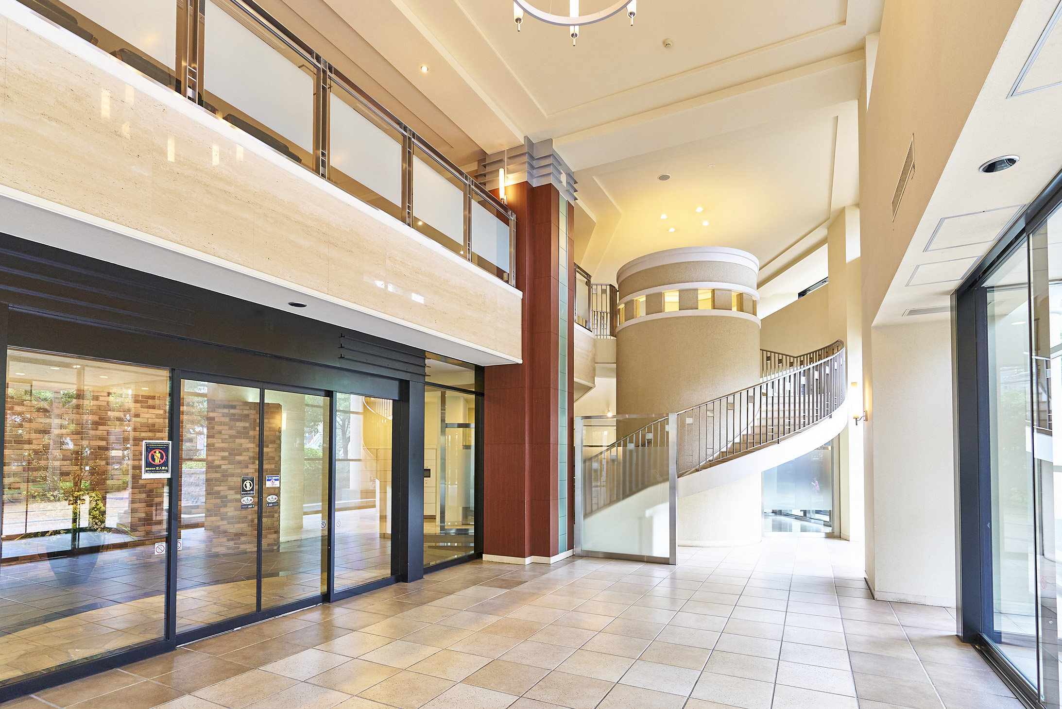 ガラスウォールと吹抜けによって明るく開放的な「The East」のエントランスです。