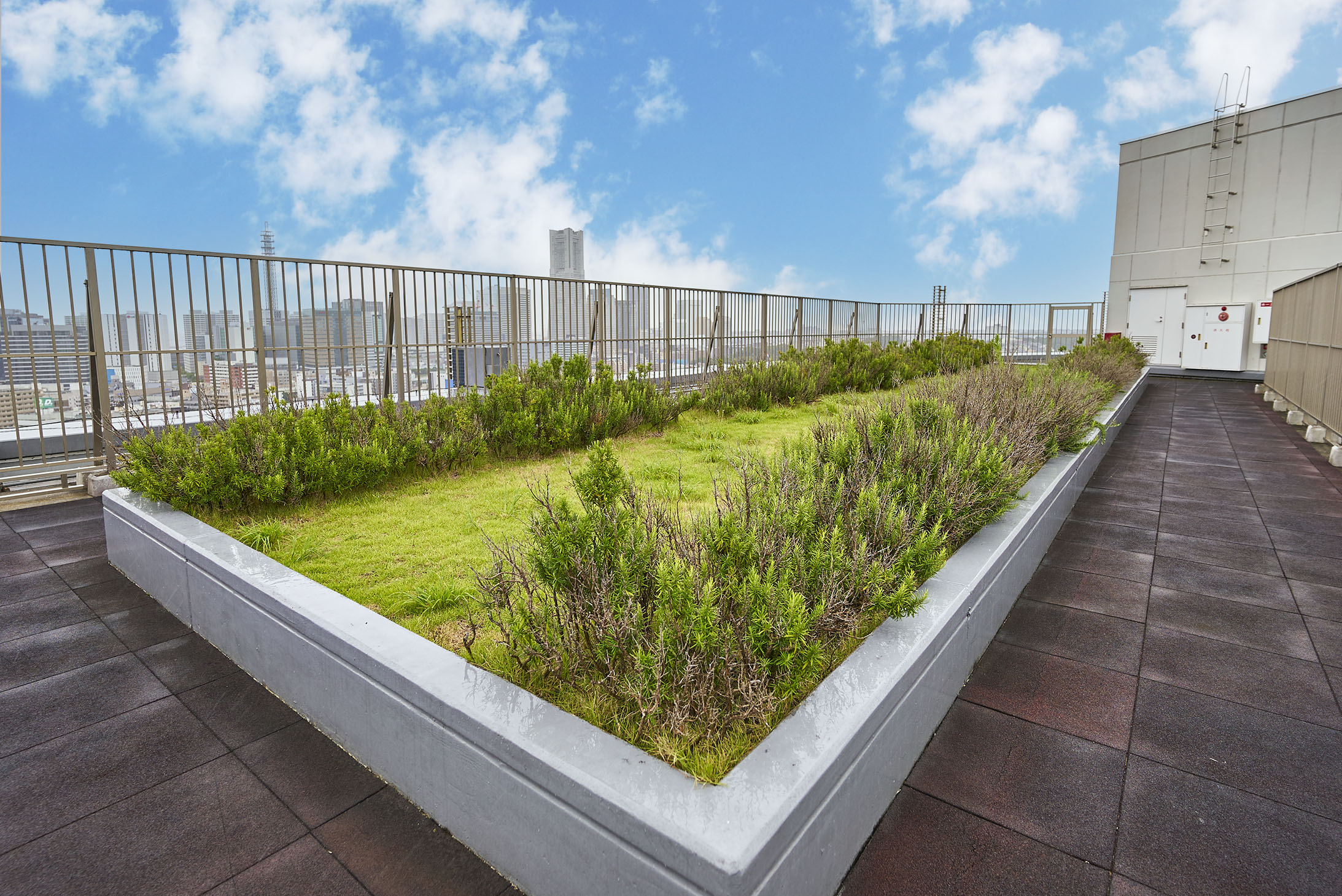 芝生のある、憩いの屋上広場。横浜で行われる花火大会も楽しめます。