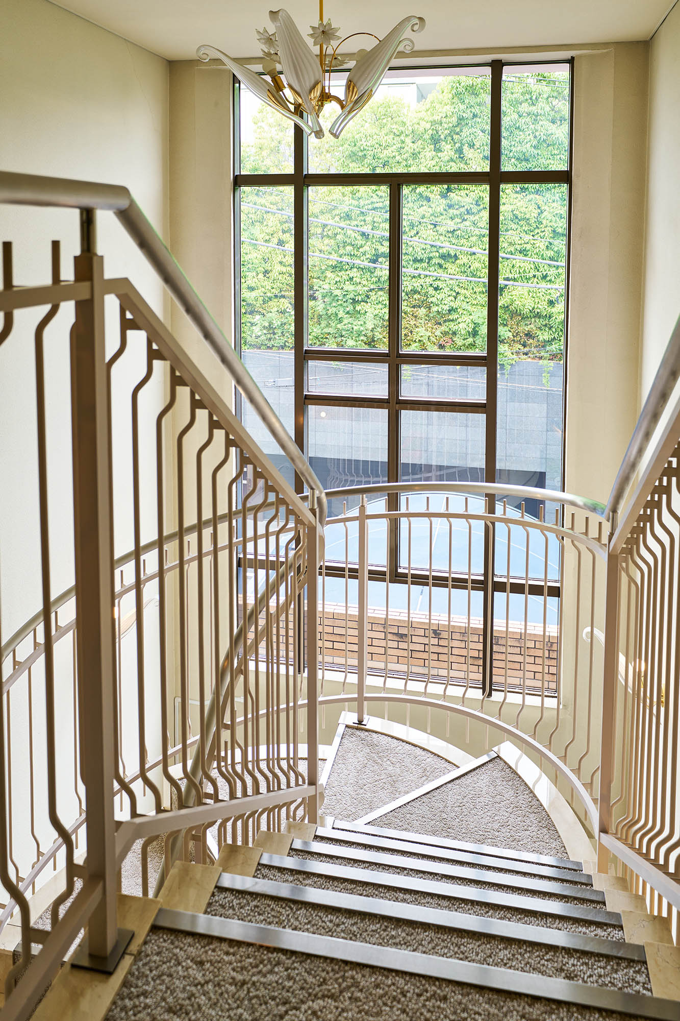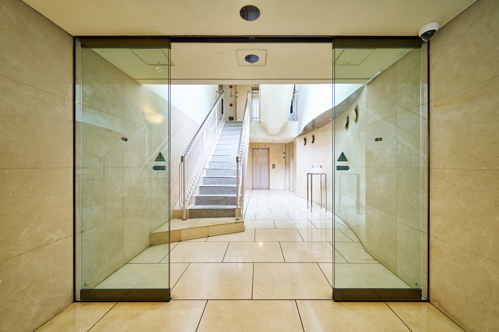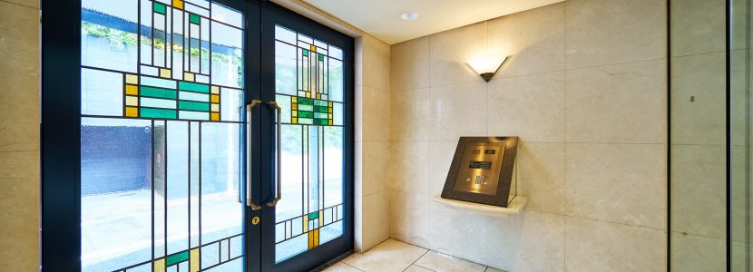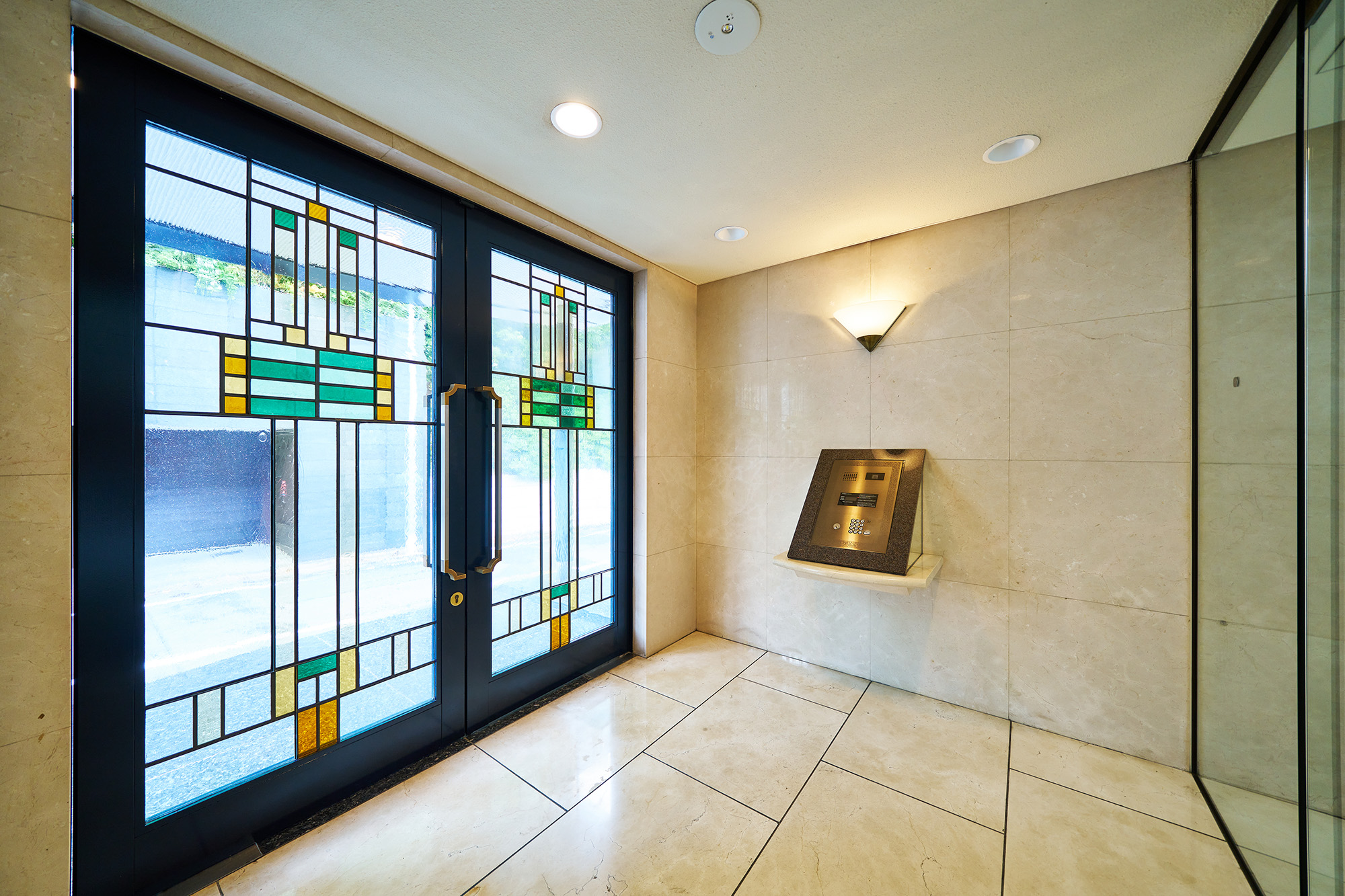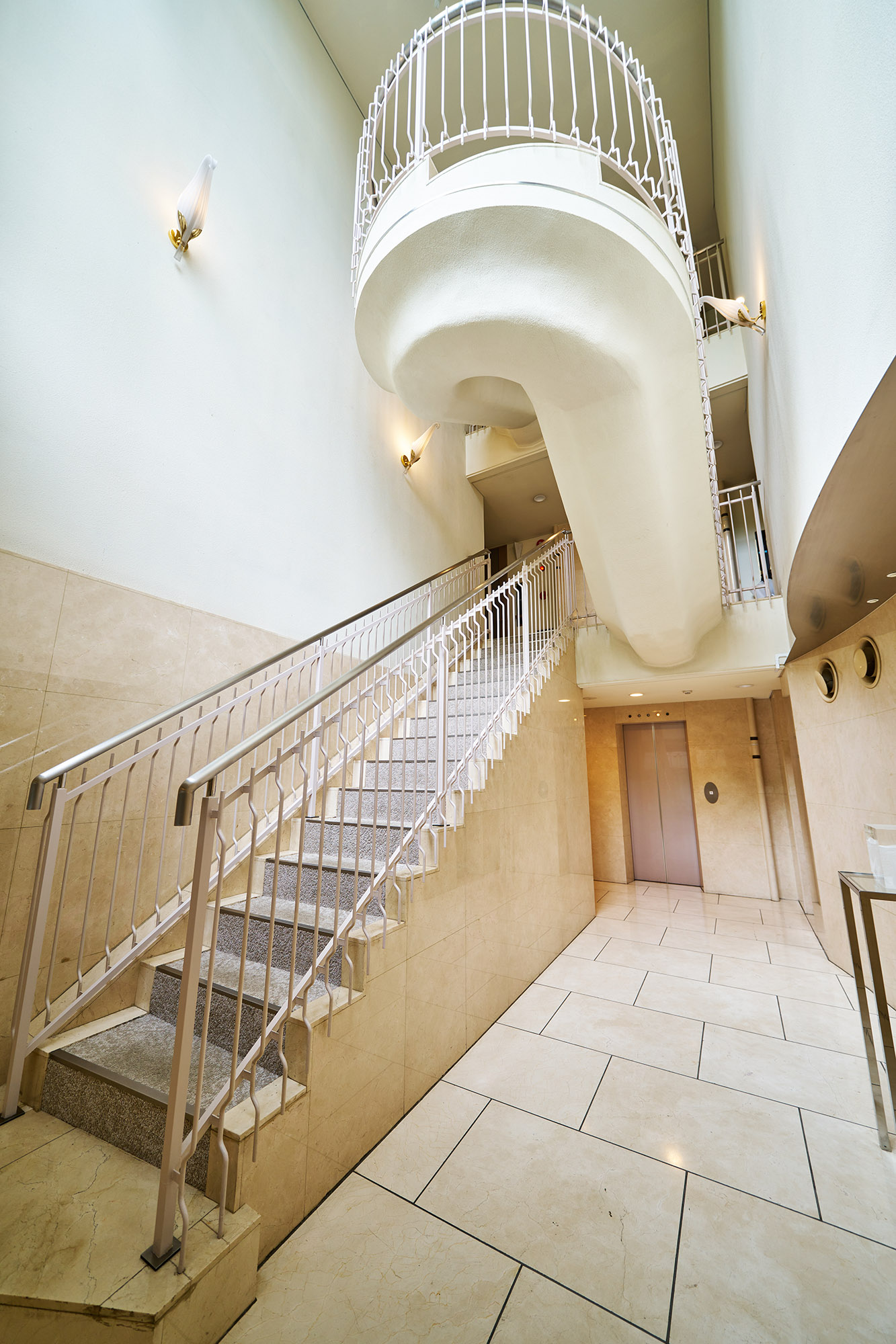 ゆるやかな曲線をつけた御影石貼りのアプローチ階段、両サイドに円柱を配したヴォールド状の庇、そしてステンドグラスを使用した大型のドアと、ひとつひとつが重厚な趣を演出するエントランス。内部は床、壁ともに大理石を使用。訪れる方々も心よくお迎えできる優雅でリッチな空間です。その先には同じく大理石を使用し、3階まで吹き抜けになったエントランスホール。大きな窓からやさしい光が差し込み、明るいパブリックスペースが広がります。優雅な曲線を描くらせん階段の階段部分には、大理石、タイルカーペットがあしらわれており、贅をこらした装い。ハイクォリティマンションならではの洗練された美しさが随所に施されています。