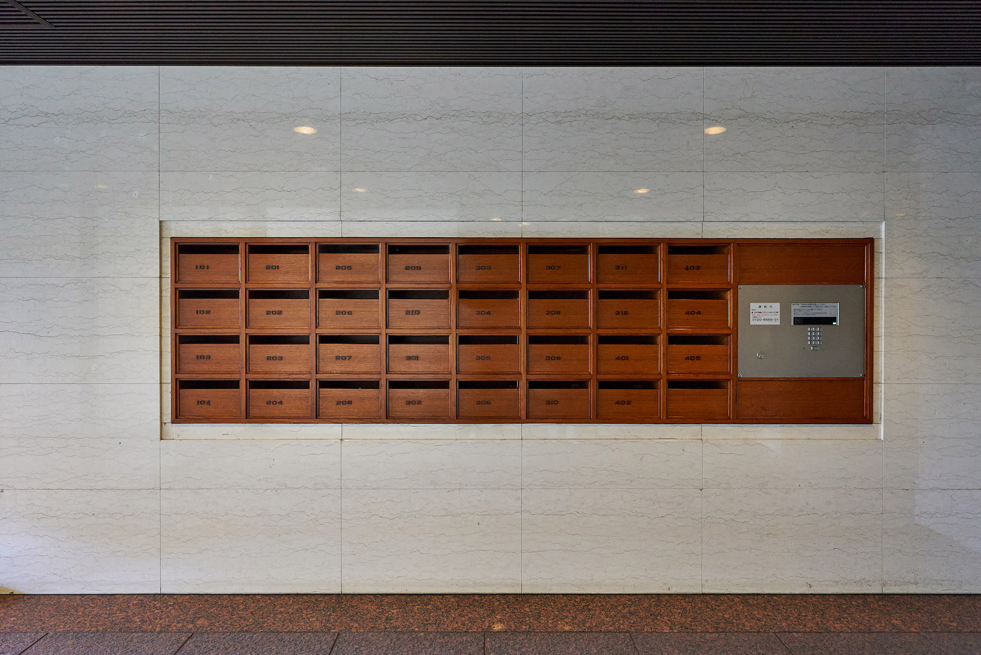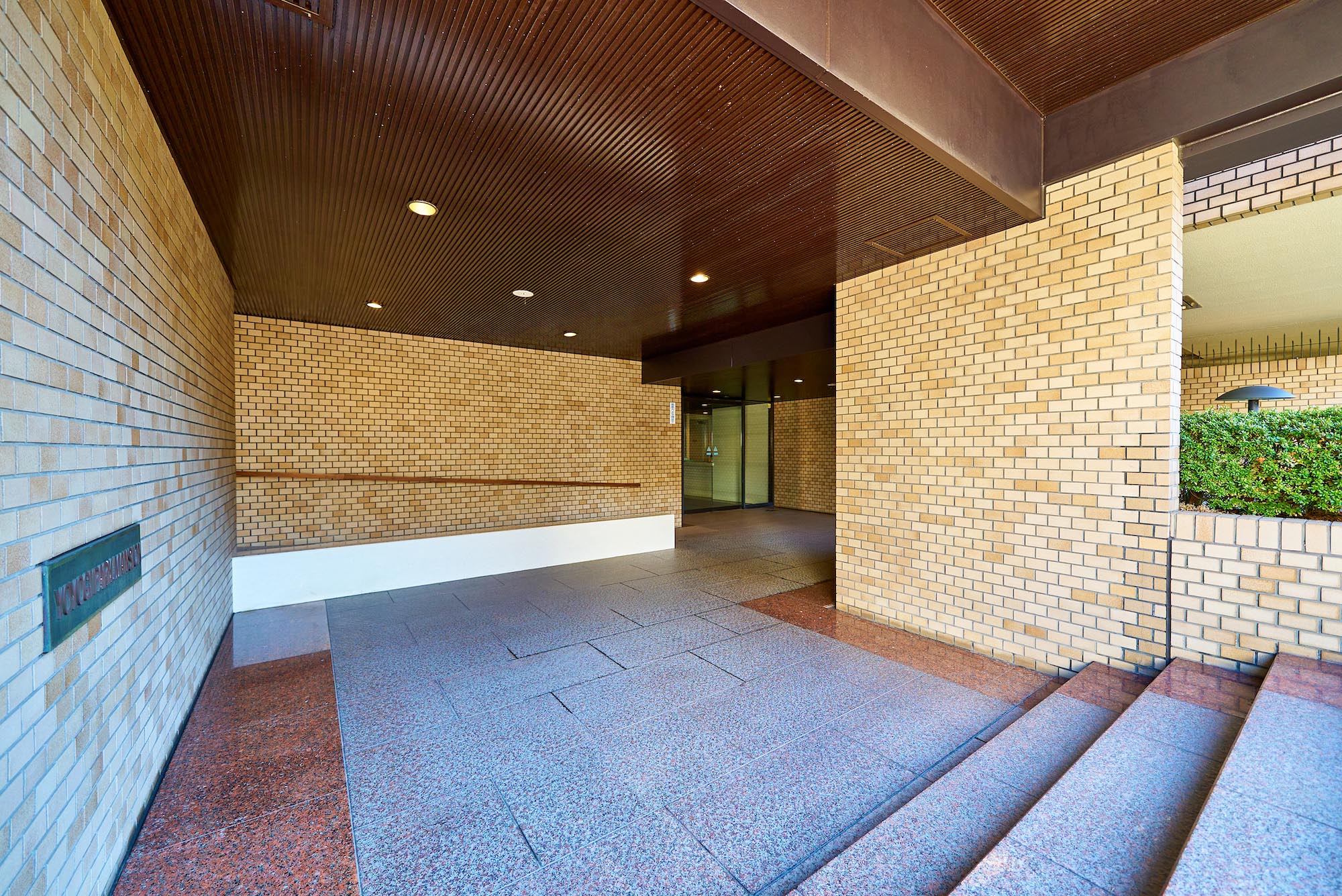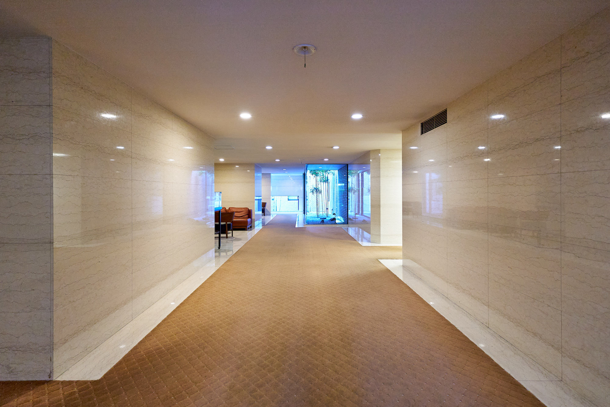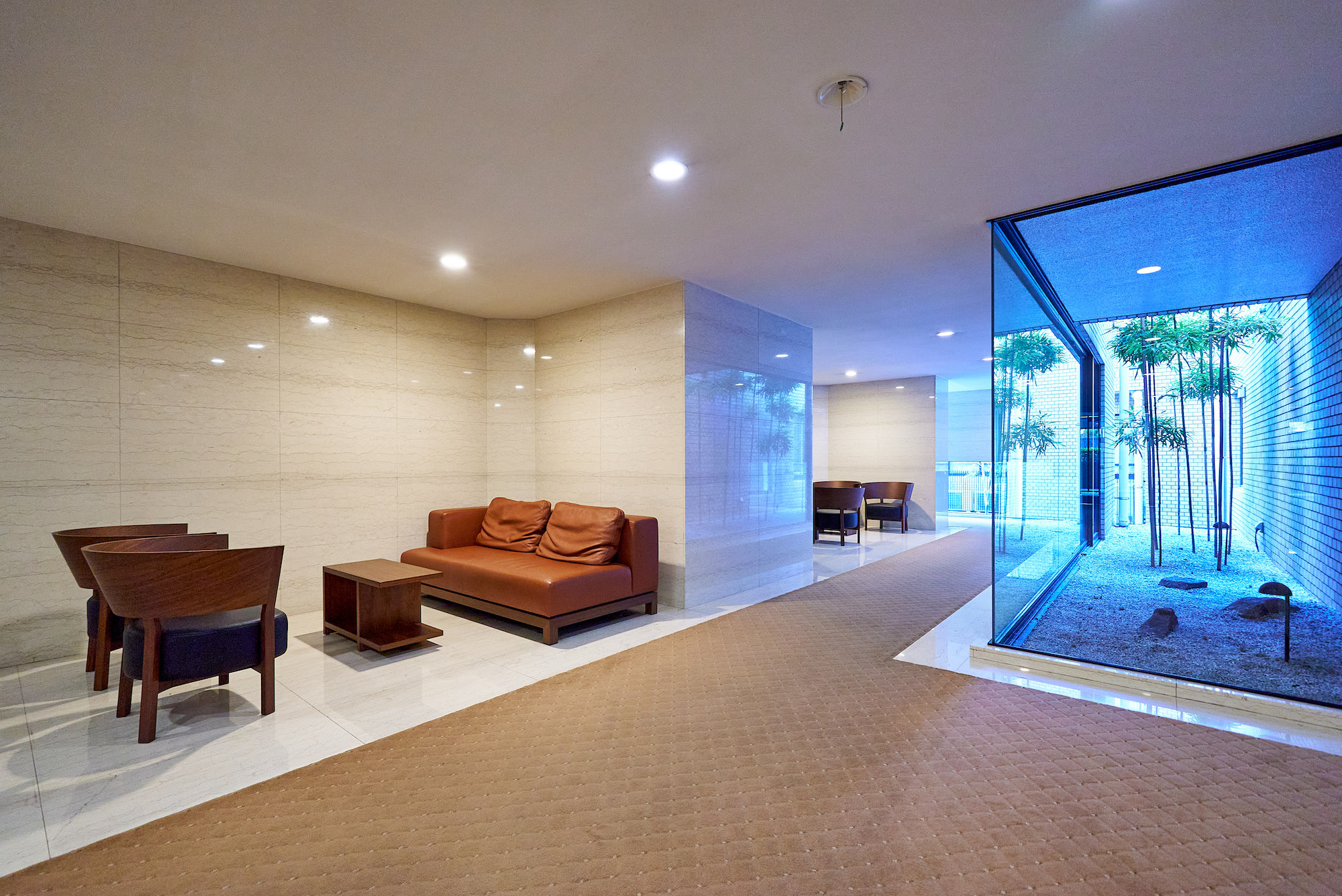 重厚感のある庇と鮮やかな植栽を携えた風格あるエントランス。数段の階段を下りた先にある入り口は、通りからの目線を避け、高いプライバシー性を確保しています。住まう方を迎えるのは、コンシェルジュカウンターとレトロなメールボックス、そして装飾が美しいガラス扉。その先には、気品あふれるエントランスホールが続いています。光を取り込む坪庭、上質な家具を備えたラウンジスペース、絨毯張りの床や高級素材の壁など、高い品格を醸す優雅な共用空間です。