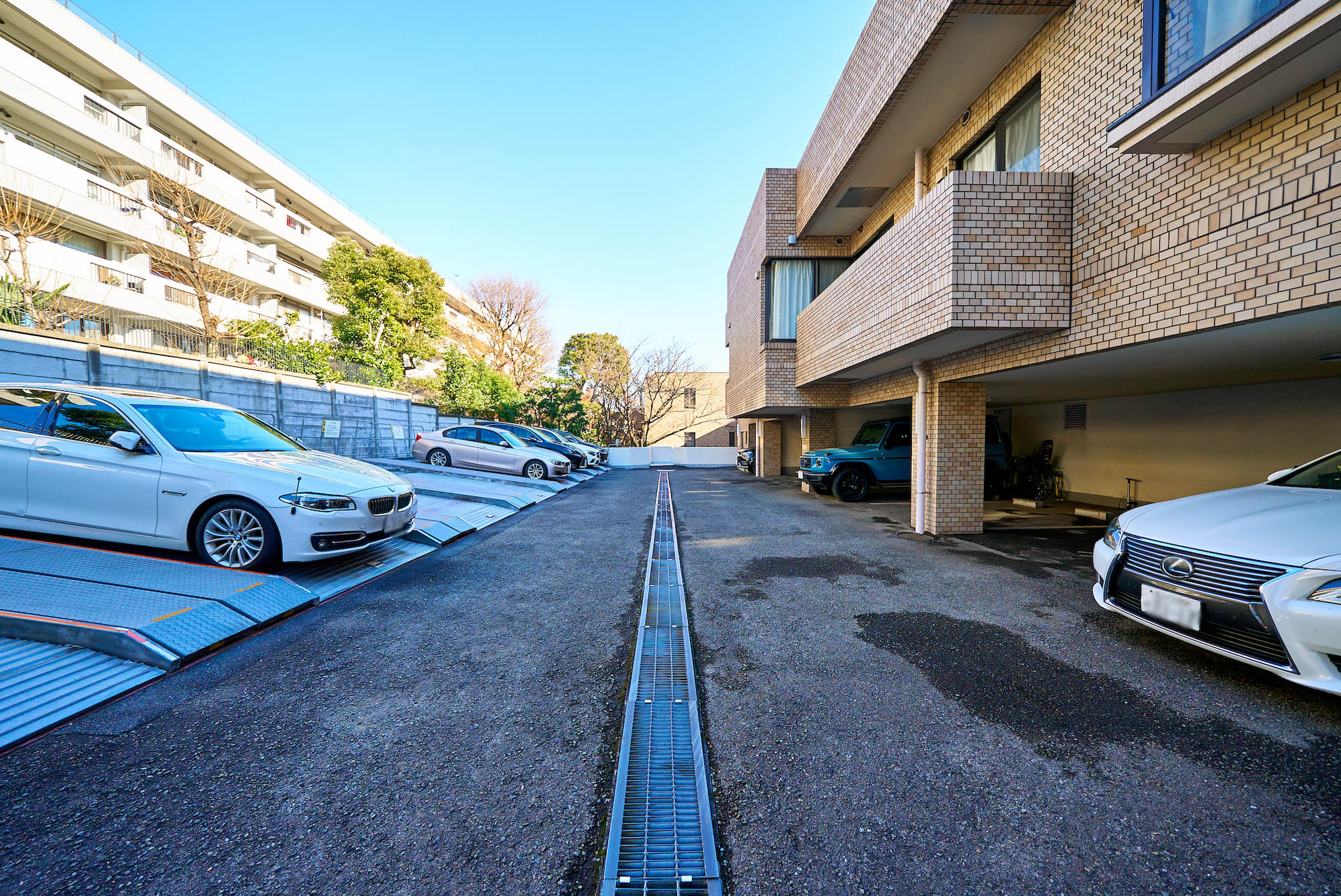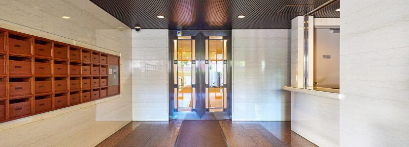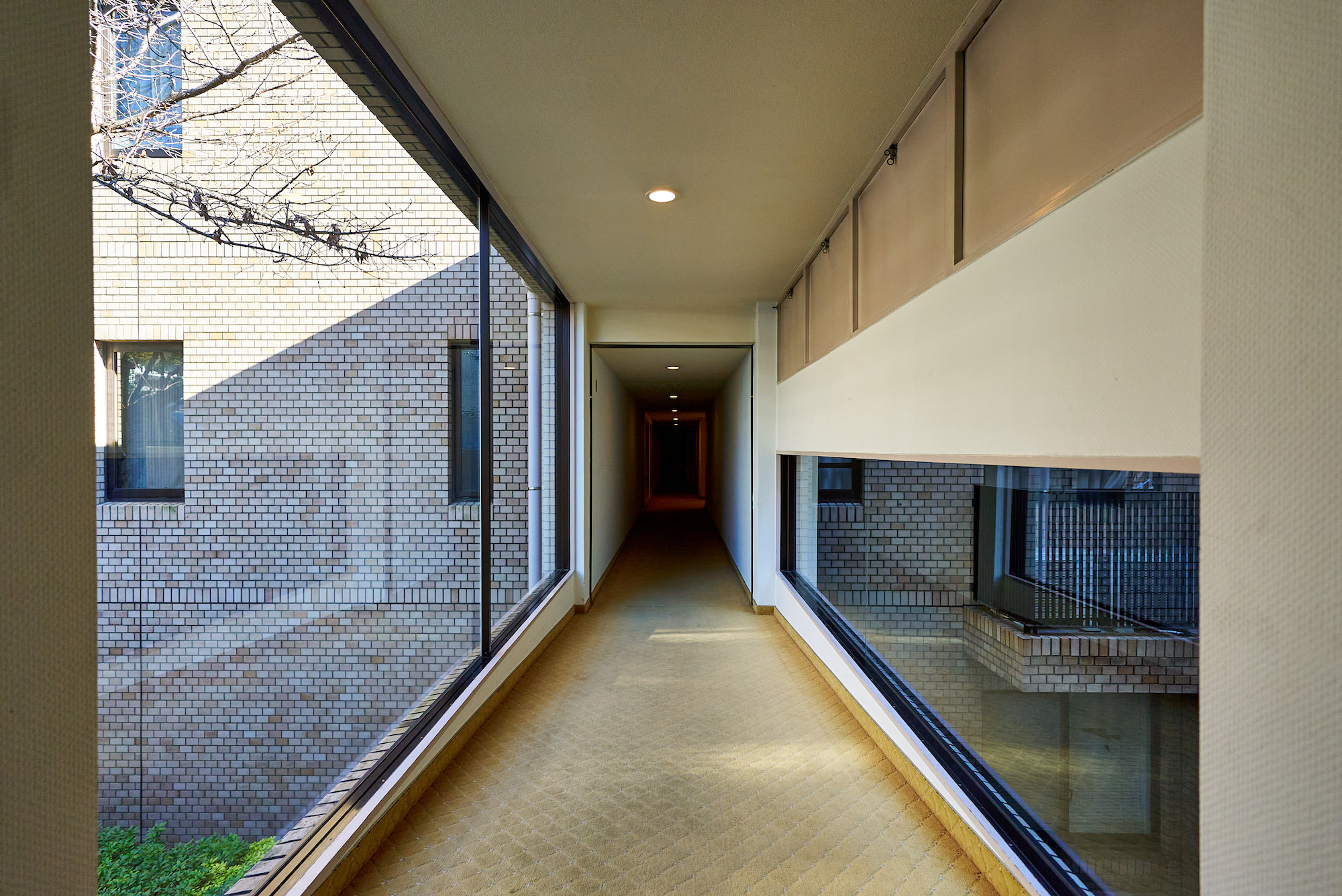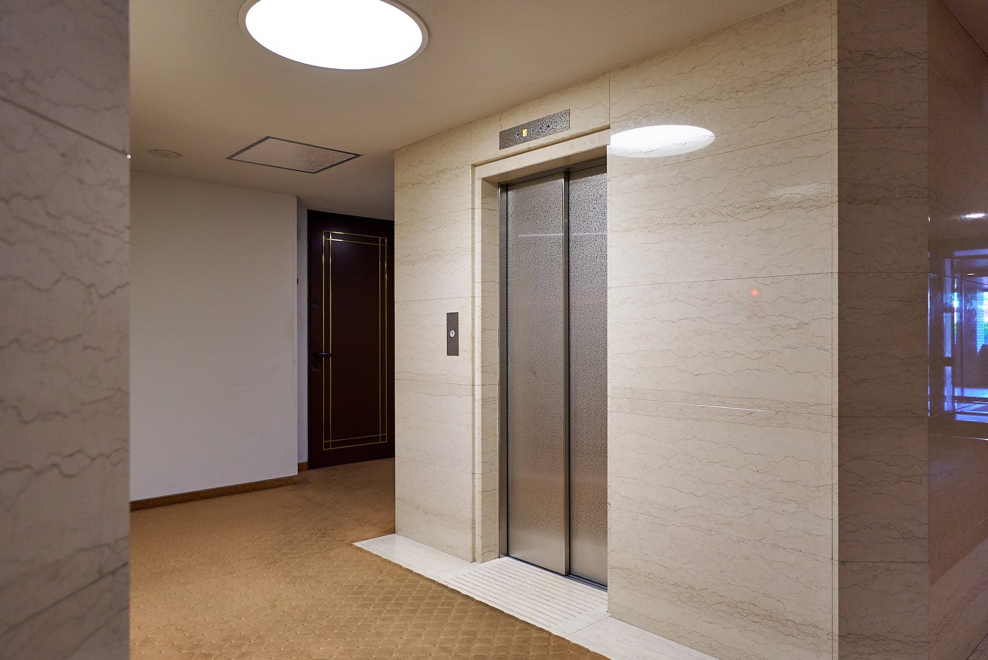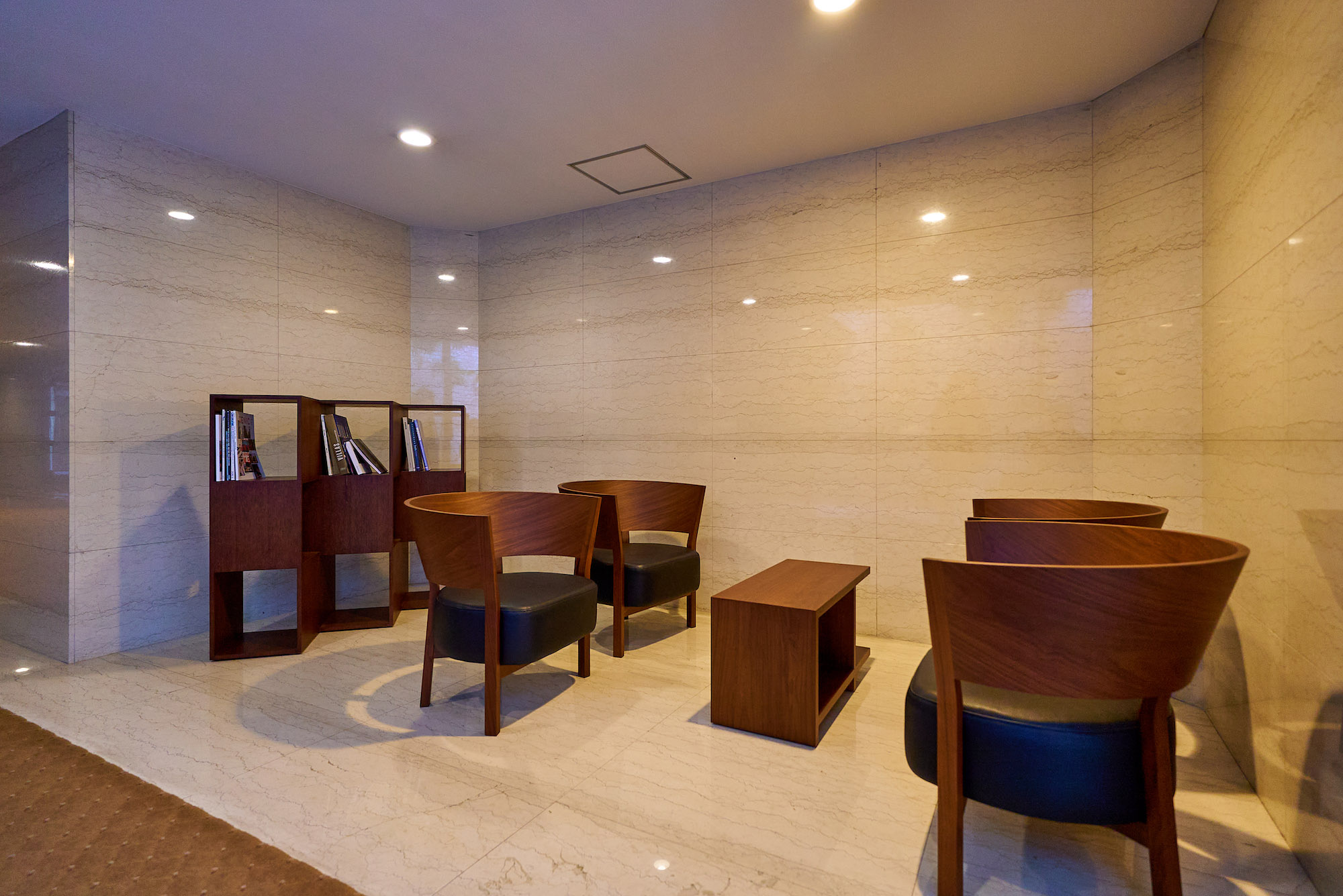 重厚感のある庇と鮮やかな植栽を携えた風格あるエントランス。数段の階段を下りた先にある入り口は、通りからの目線を避け、高いプライバシー性を確保しています。住まう方を迎えるのは、コンシェルジュカウンターとレトロなメールボックス、そして装飾が美しいガラス扉。その先には、気品あふれるエントランスホールが続いています。光を取り込む坪庭、上質な家具を備えたラウンジスペース、絨毯張りの床や高級素材の壁など、高い品格を醸す優雅な共用空間です。